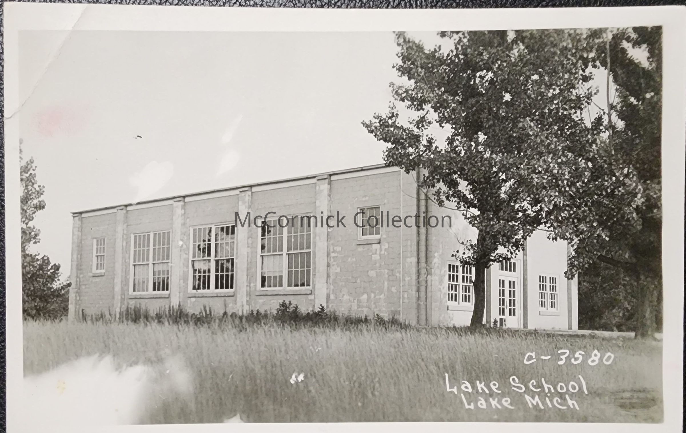 Real photo postcard of the Lake School in Lake, Michigan. Lake postmark, circa 1951. Negative number is C-3580.