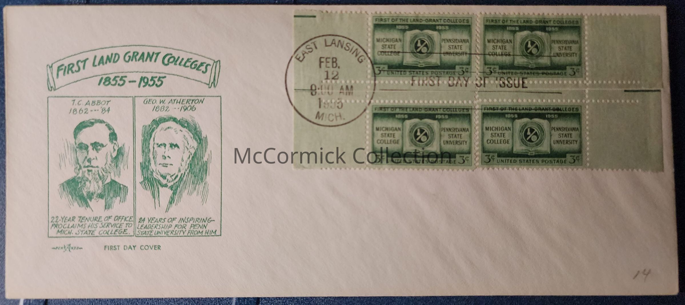 First day cover from the centennial of the First Land Grant Colleges, Michigan State and Penn State. It features MAC president Abbot and PSU president Atherton. Postmarked 1955 East Lansing.