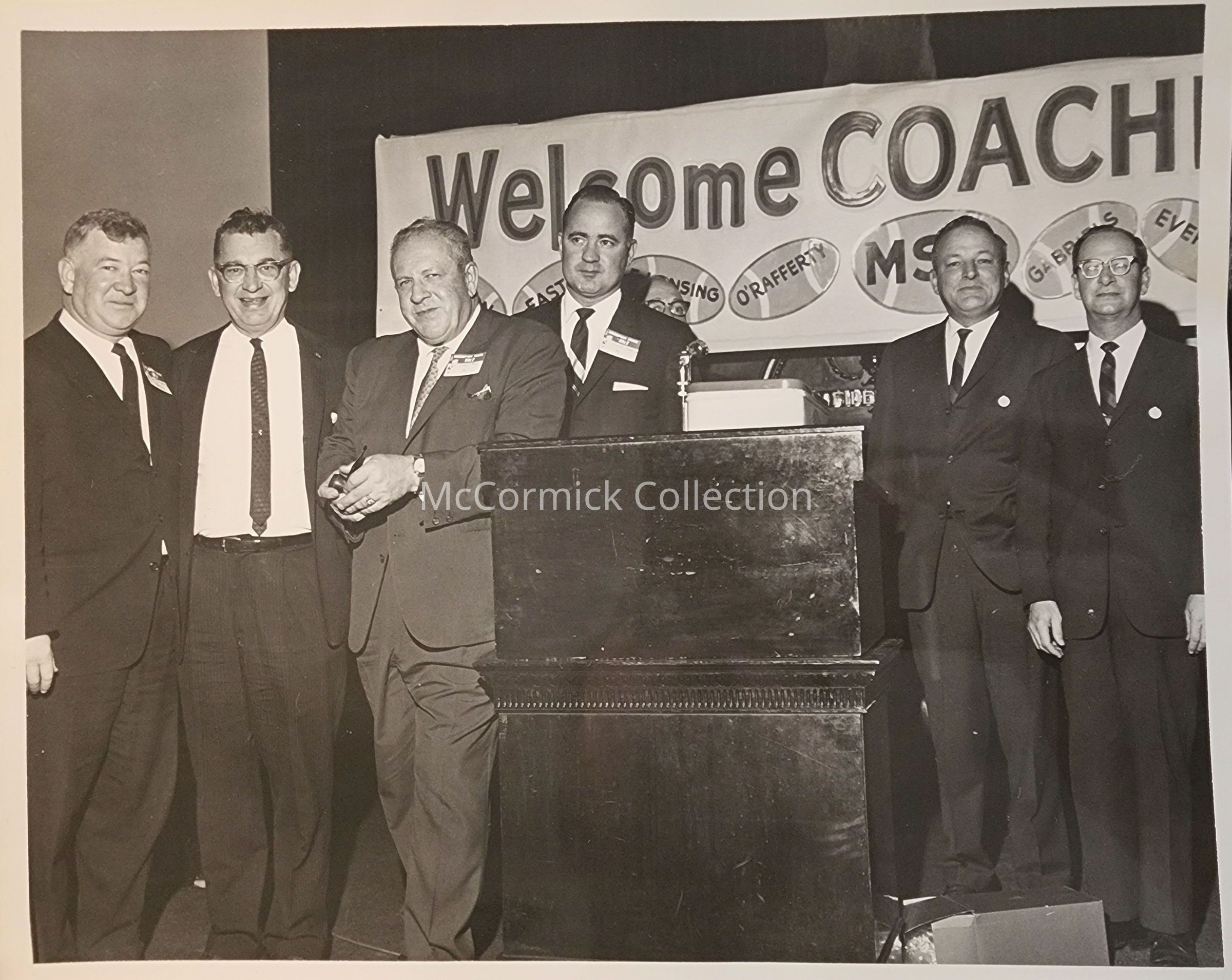 Photographic print of a "Welcome Coaches" event with a banner listing Sexton, Eastern, East Lansing, O'Rafferty, MSU, Gabriels, Everett, and Waverly. Pictured are Duffy Daugherty (left), Biggie Munn (third from left), and Willard Nelson (far right), among unidentified others. Circa 1960s. Two copies.