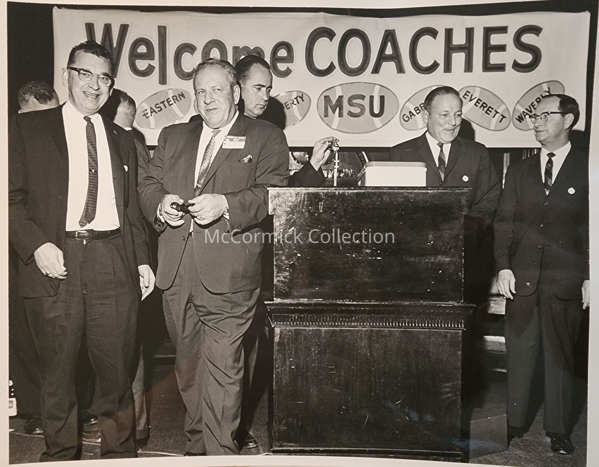 Photographic print of a "Welcome Coaches" event with a banner listing Sexton, Eastern, East Lansing, O'Rafferty, MSU, Gabriels, Everett, and Waverly. Pictured are Biggie Munn (second from left), and Willard Nelson (far right), among unidentified others. Circa 1960s.