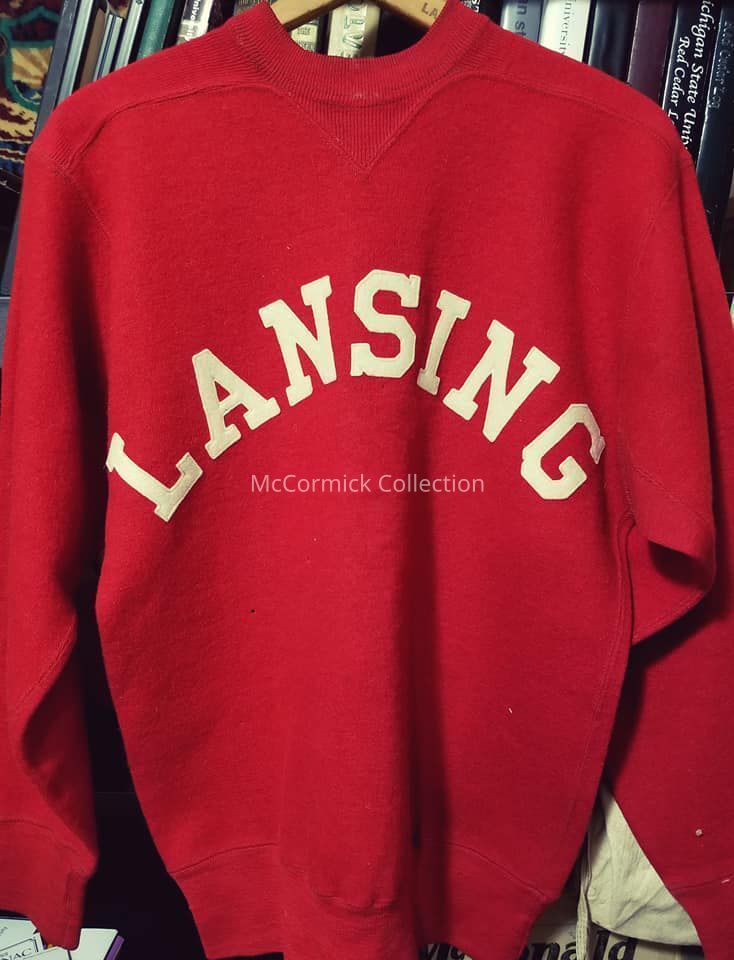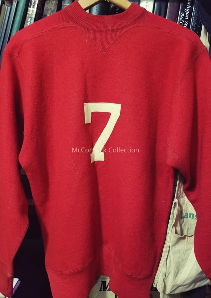 Red wool sweater, made by Spalding, circa 1940s. "Lansing" is emblazoned on the front with the number 7 of the back. Other than a few small moth holes, the sweater is in good condition.