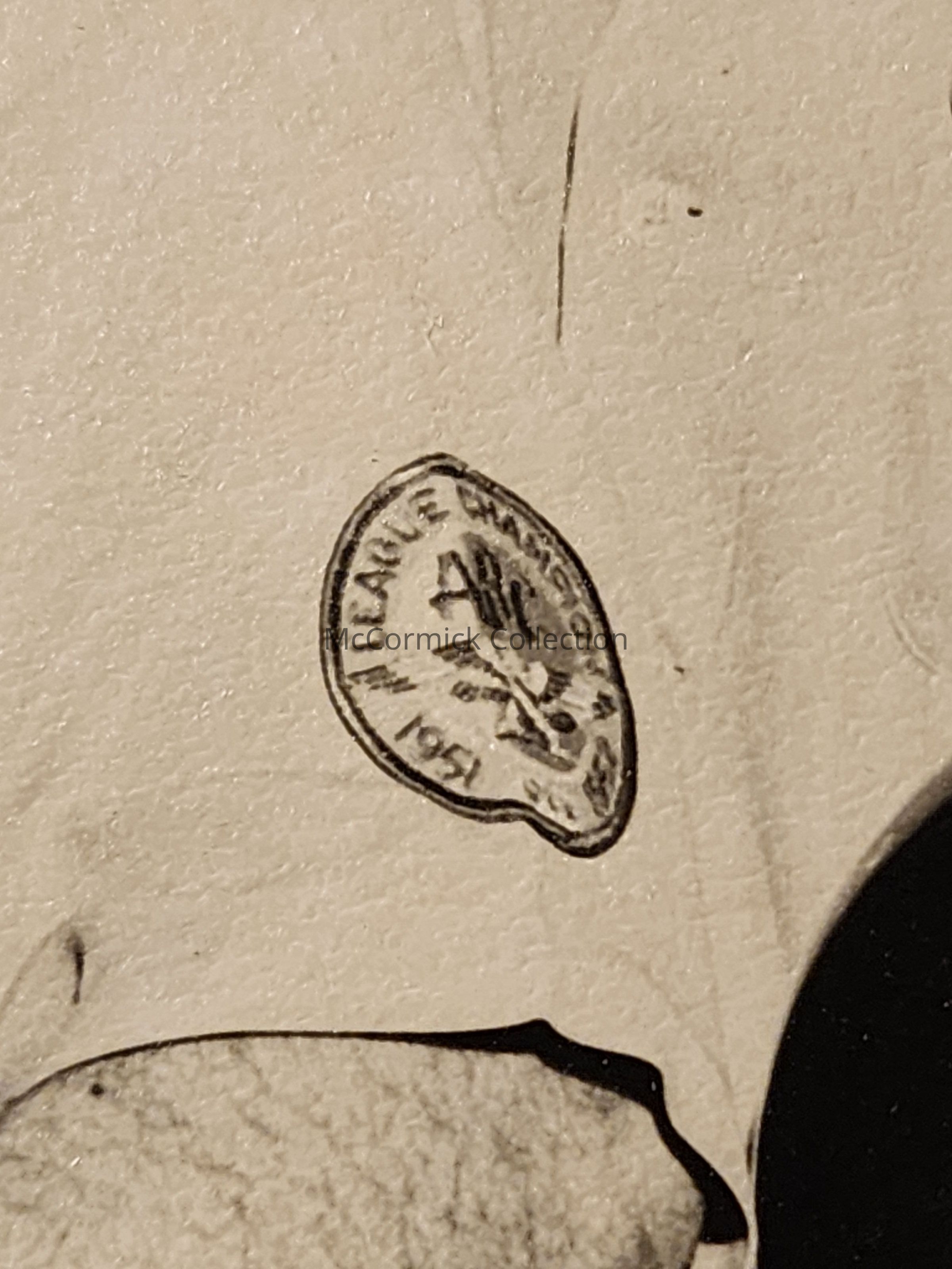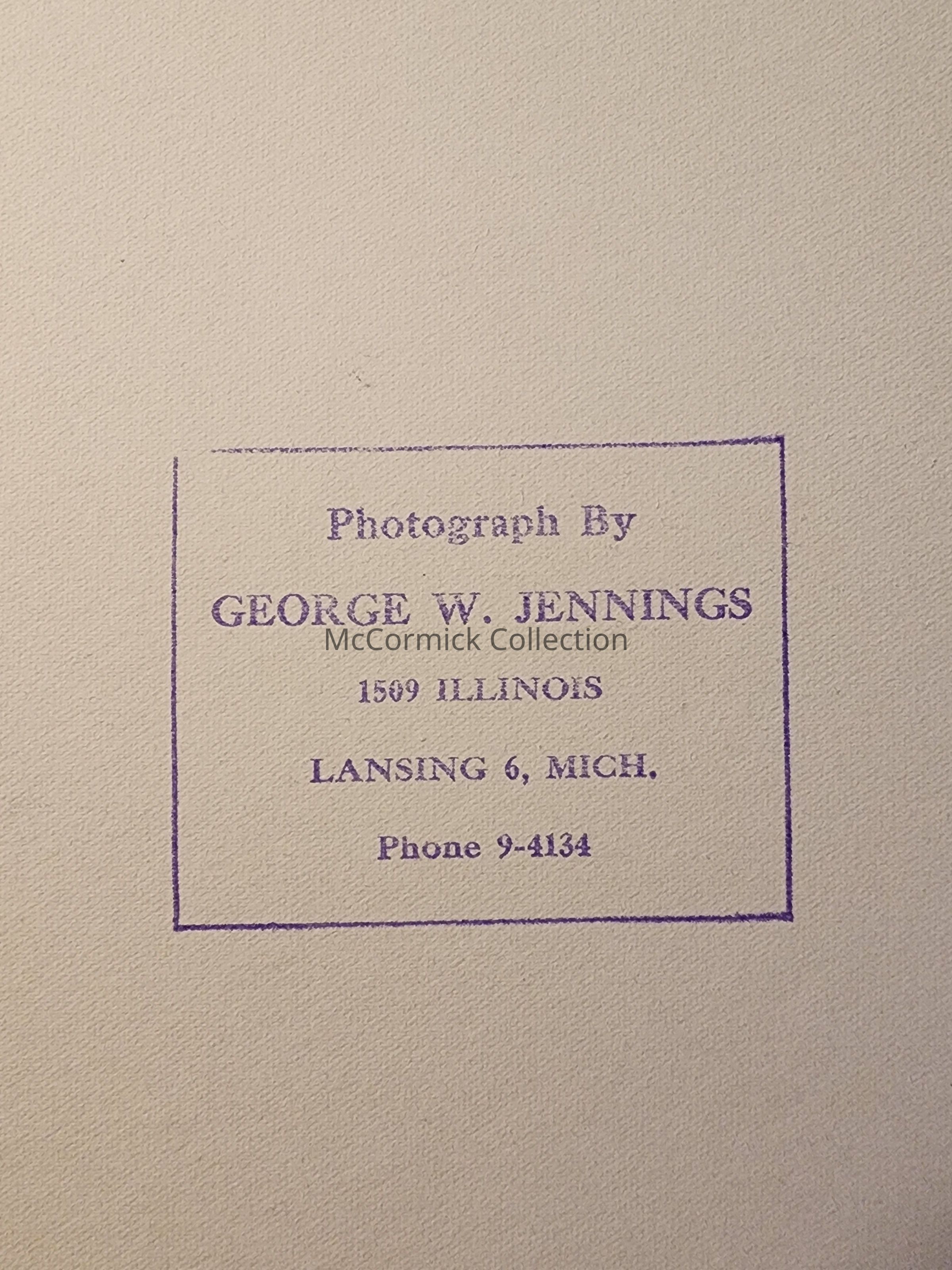 Photographic print of a group of five bowling league members with a 1951 league champions patch. Taken by Lansing photographer George W. Jennings.