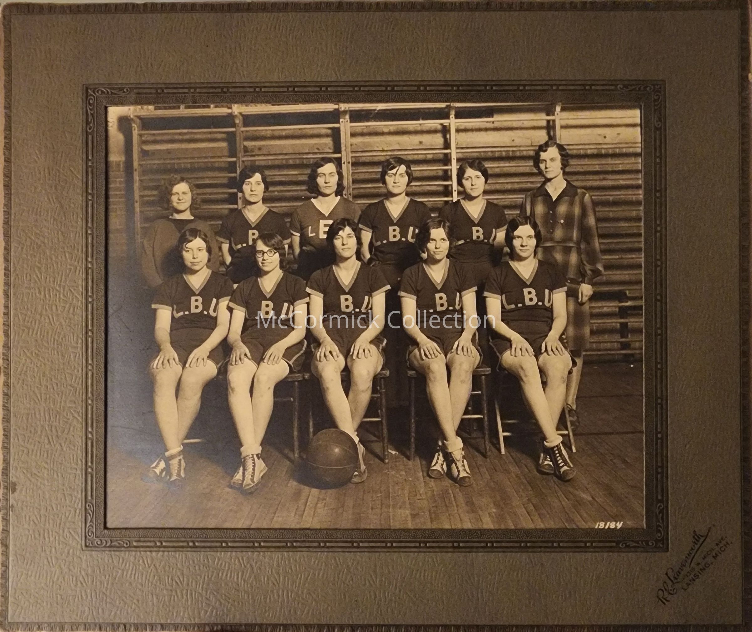 Photograph in a mounted frame of the Lansing Business University women's basketball team by Lansing photographer R.C. Leavenworth.