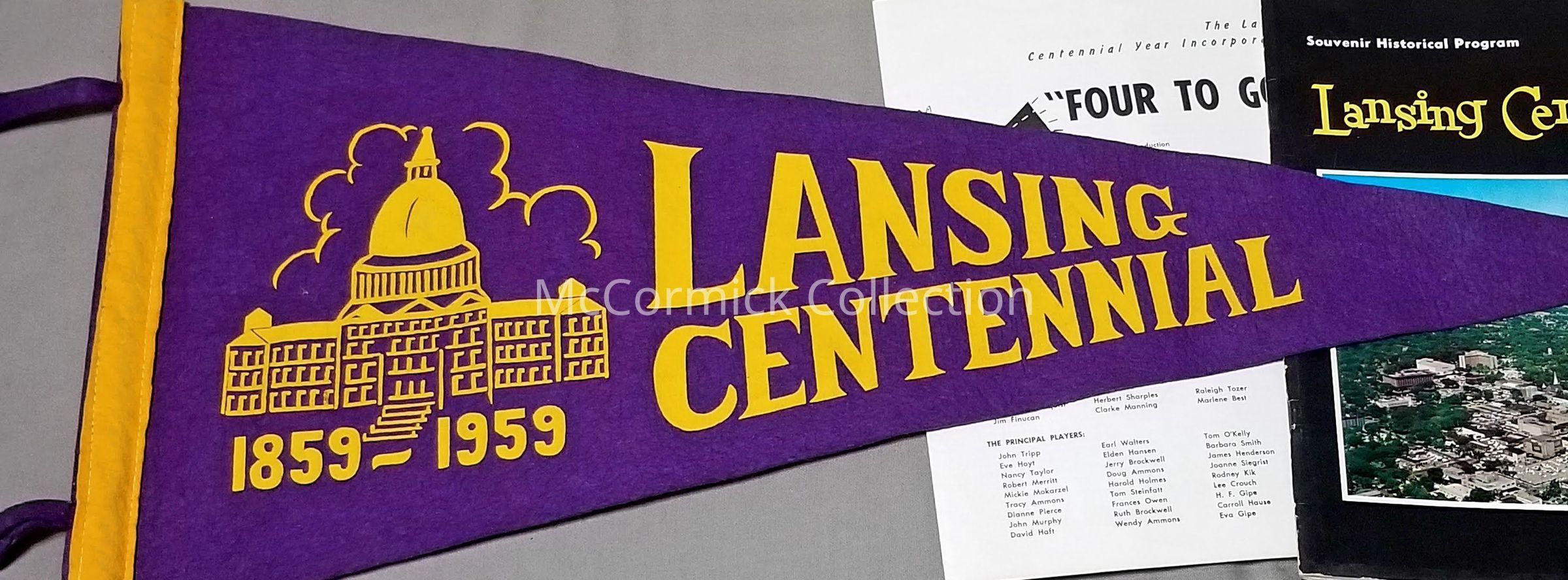 Purple and yellow pennant from the 1959 Lansing, Michigan, centennial. Features an image of the Capitol.