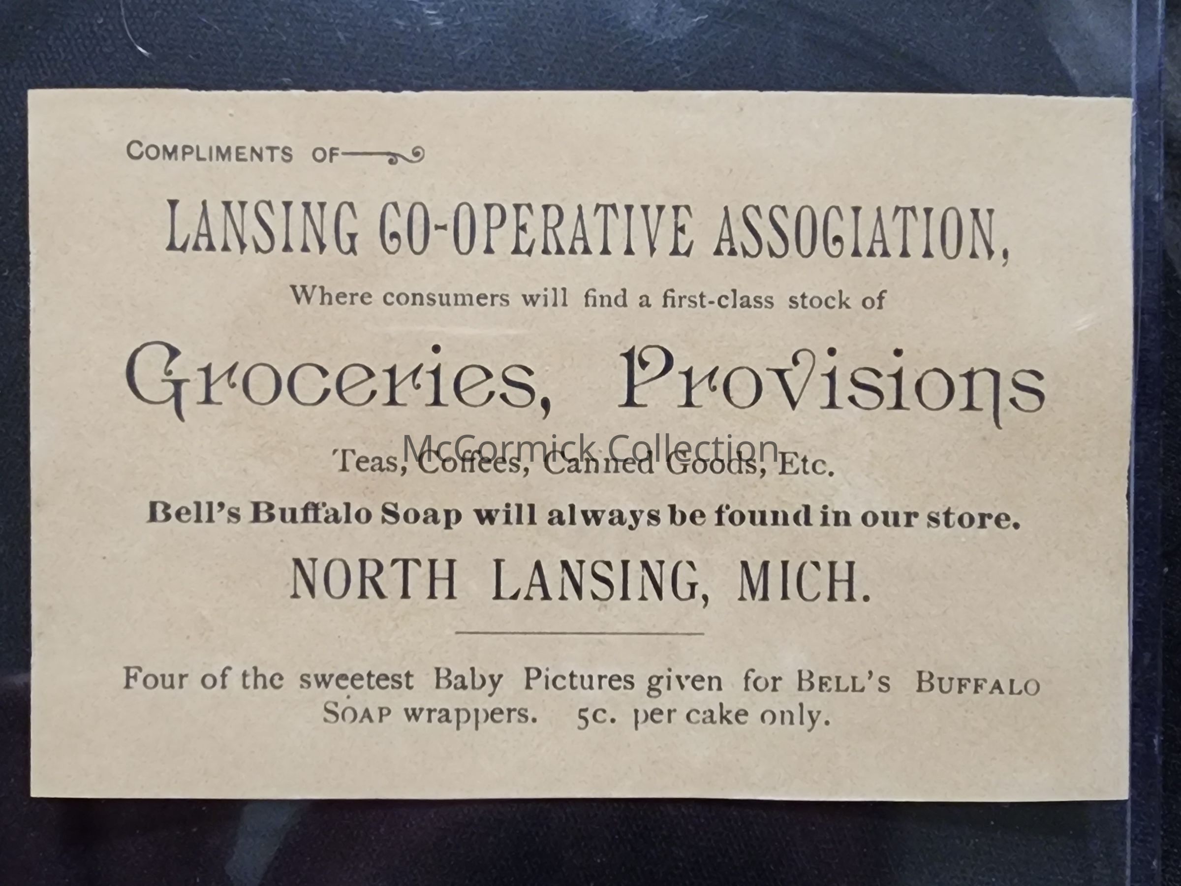 A trade card from the Lansing Co-Operative Association of Groceries and Provisions in North Lansing. Bell's Buffalo Soap wrapper advertising.