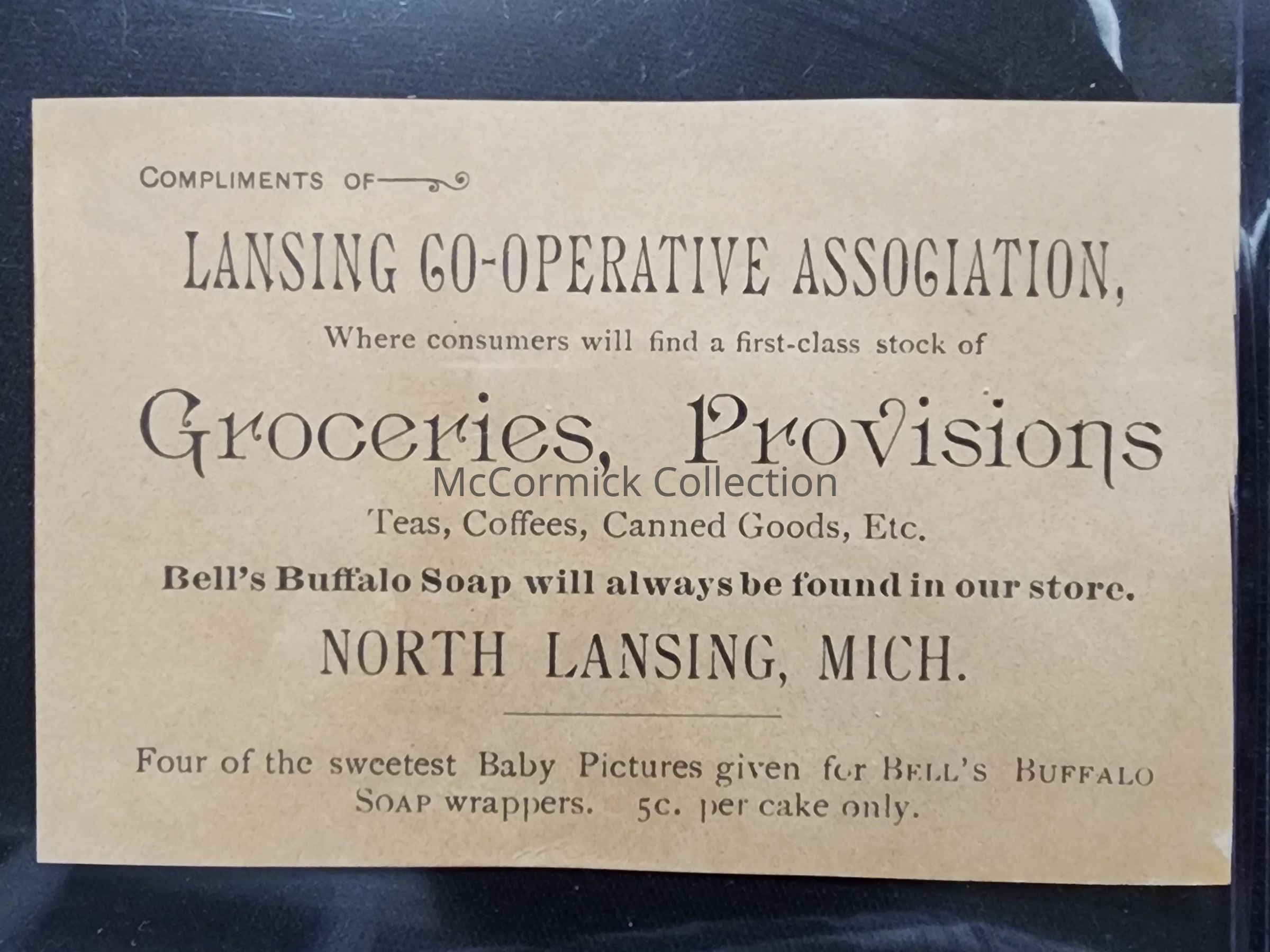 A trade card from the Lansing Co-Operative Association of Groceries and Provisions in North Lansing. Bell's Buffalo Soap wrapper advertising.