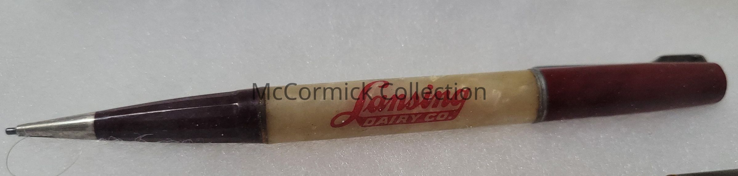 A cracked ice and maroon advertising mechanical pencil from Lansing Dairy Company of Lansing, Michigan, circa 1950s.