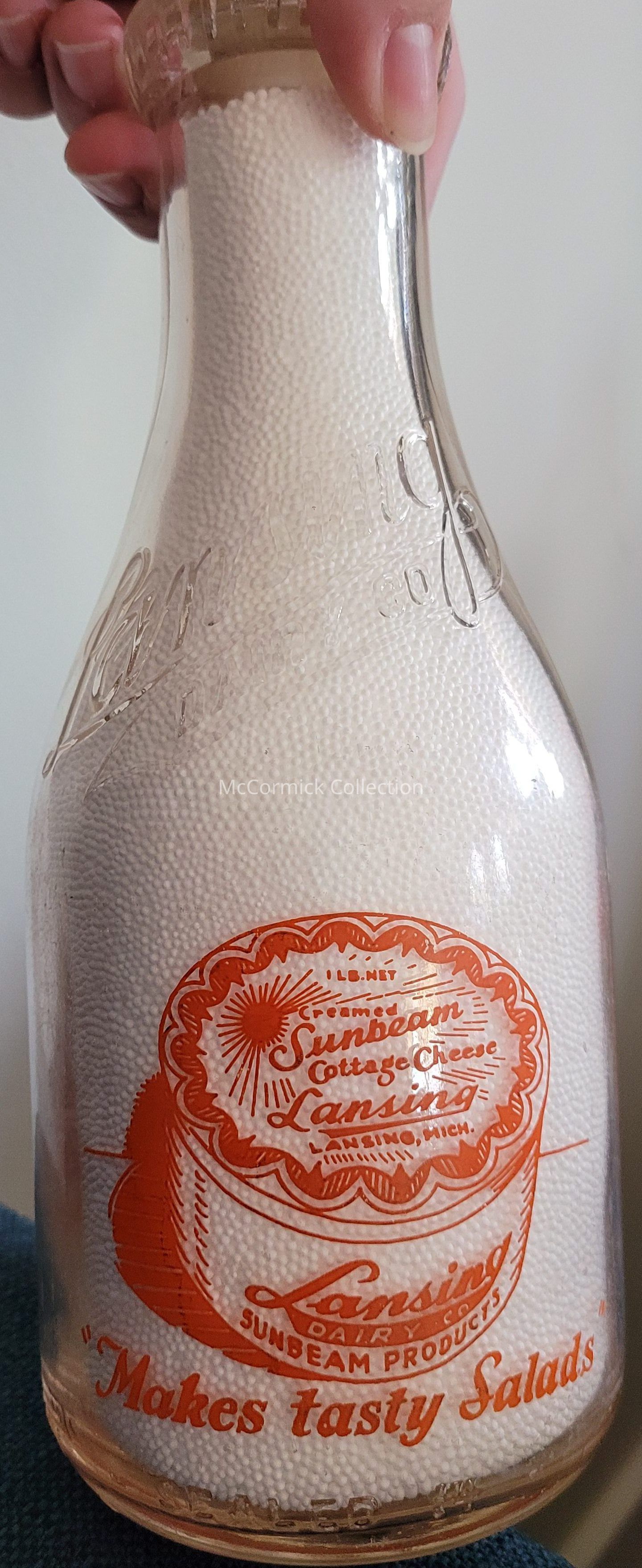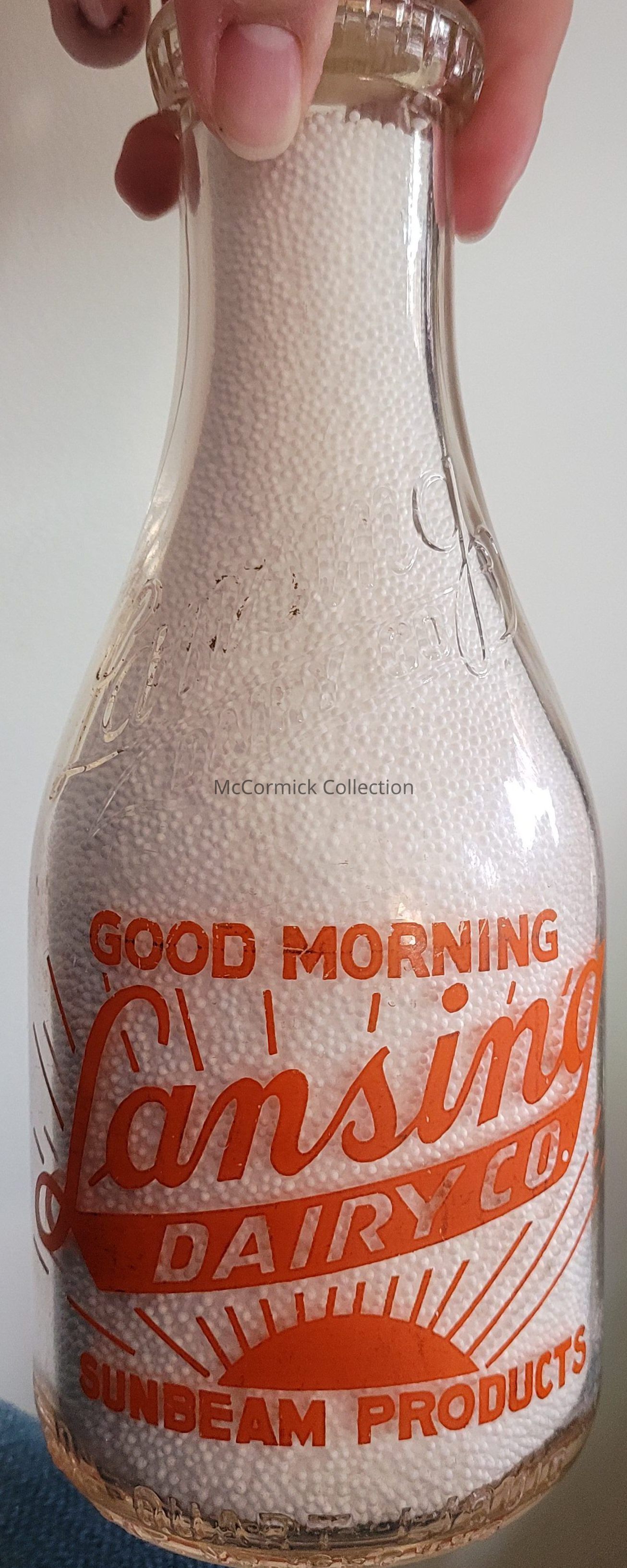 A round tall-neck orange pyro quart bottle from the Lansing Dairy Co. A "Good Morning" slogan. The back slogan is for "Creamed Sunbeam Cottage Cheese."