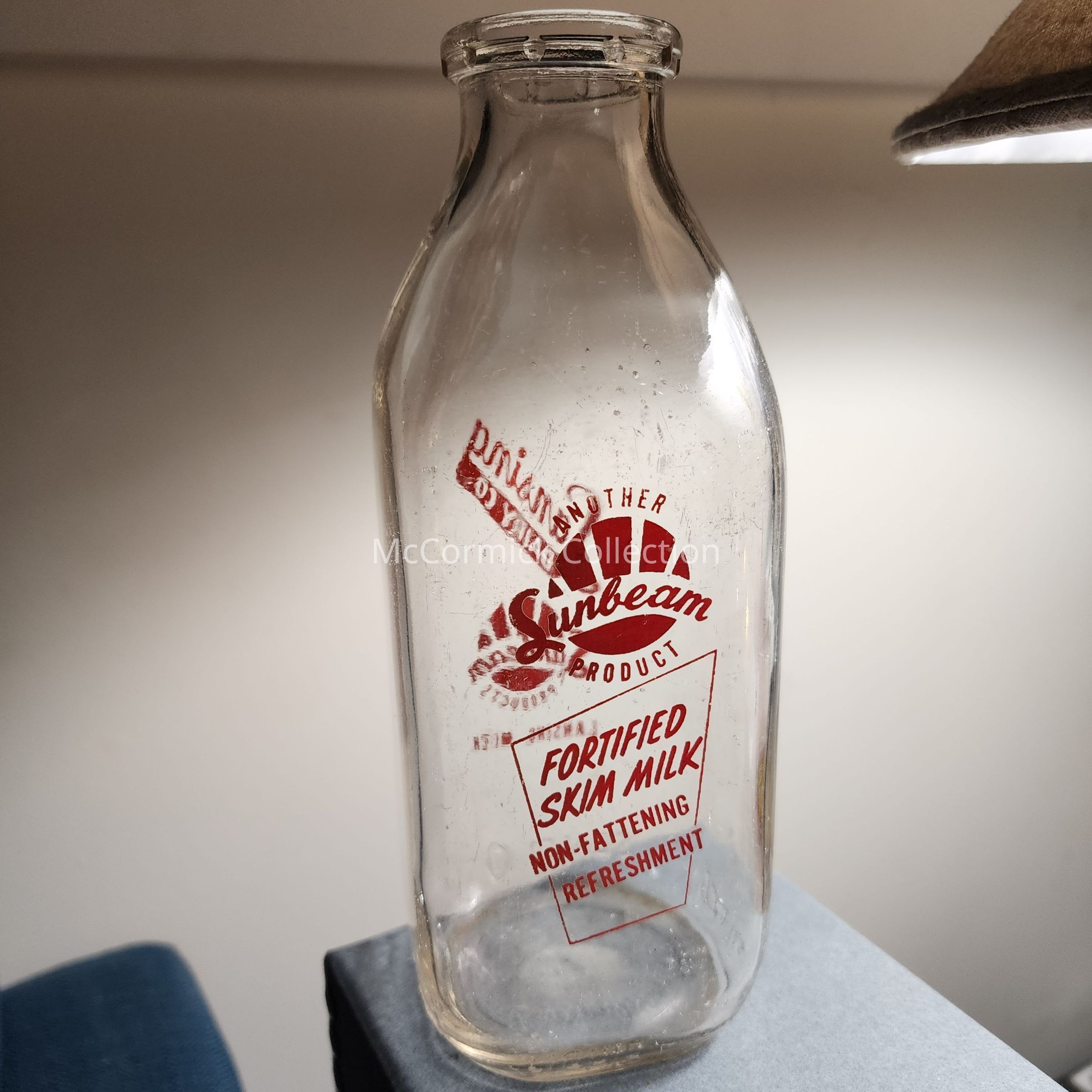A square quart with red pyro for the Lansing Dairy Co. and Fortified Skim Milk back slogan. Also features Sunbeam seals.