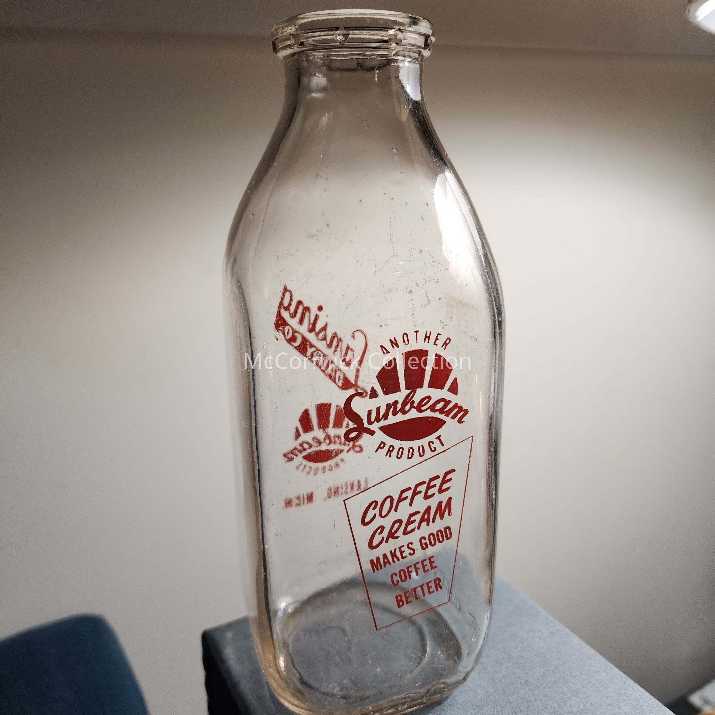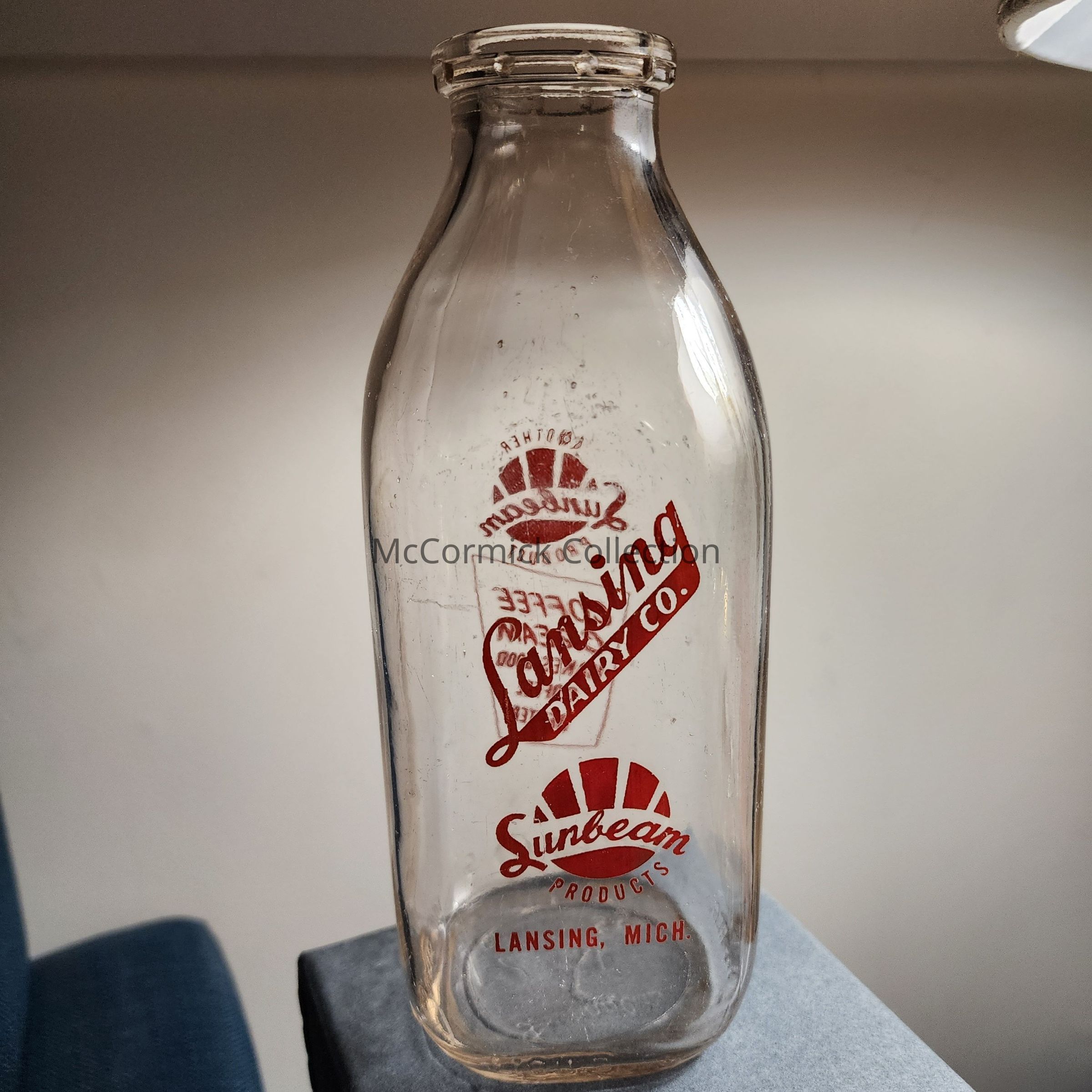 A square quart with red pyro for Lansing Dairy Co. with Coffee Cream back slogan. Also features Sunbeam seals.