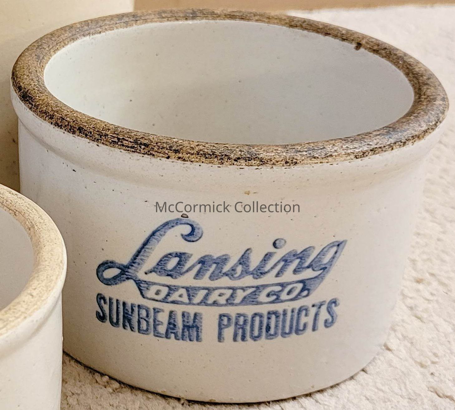 An advertising stoneware crock with blue print from the Lansing Dairy Co. Sunbeam Products. About 4.5" deep.