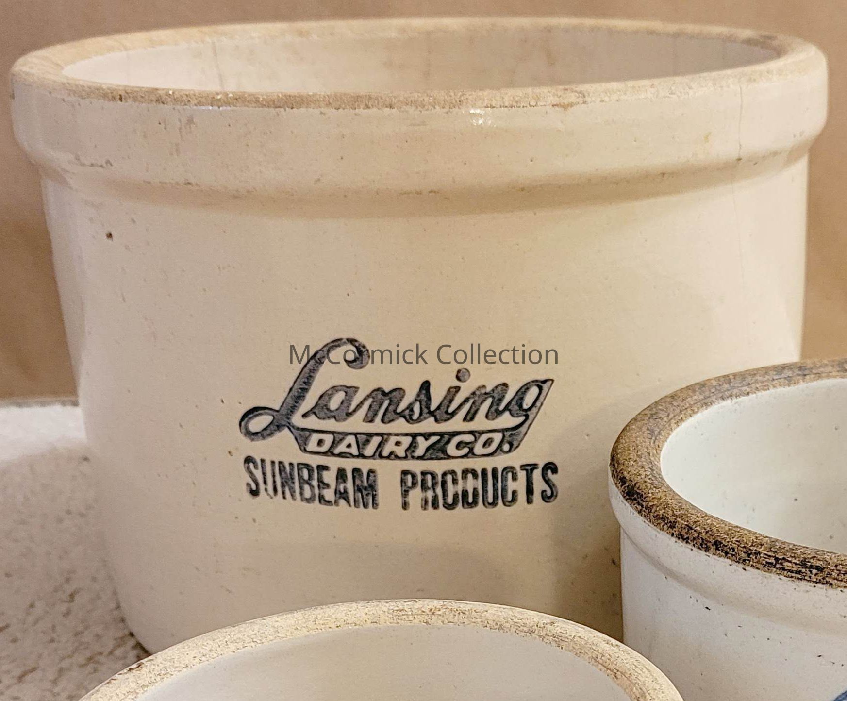 An advertising stoneware crock with blue print from the Lansing Dairy Co. Sunbeam Products. About 6" deep, the largest.