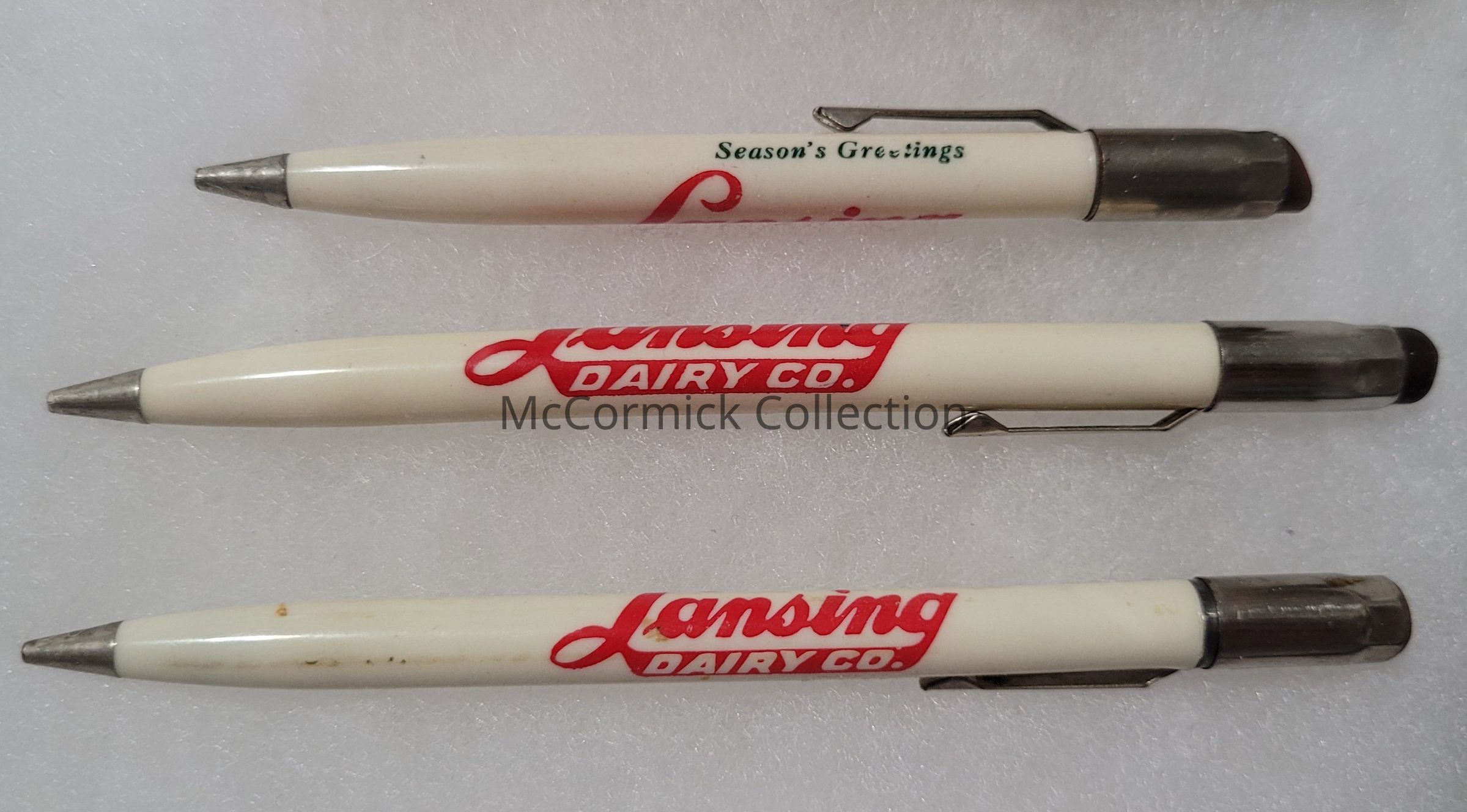 Group of three similar red, white, and green advertising mechanical pencils from the Lansing Dairy Company with Season's Greetings slogan.