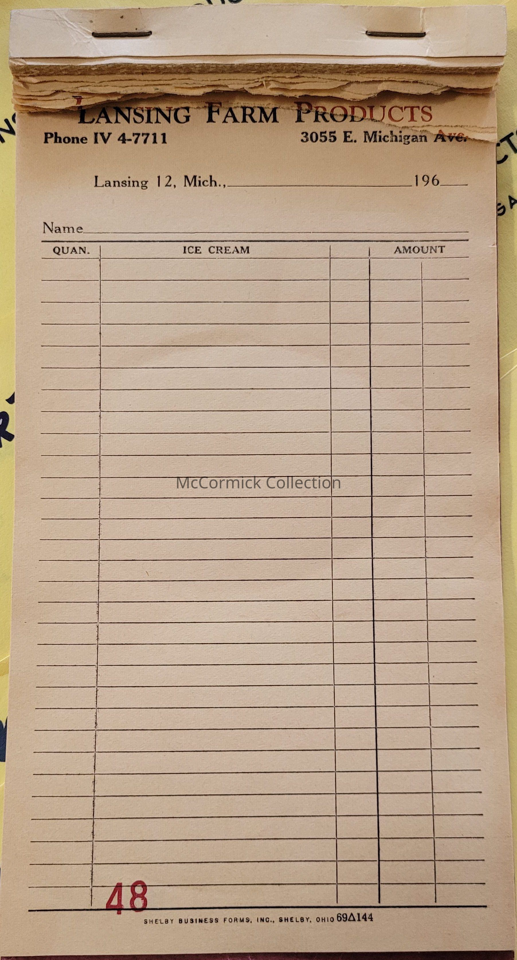 A partially used notepad of Lansing Farm Products order slips.