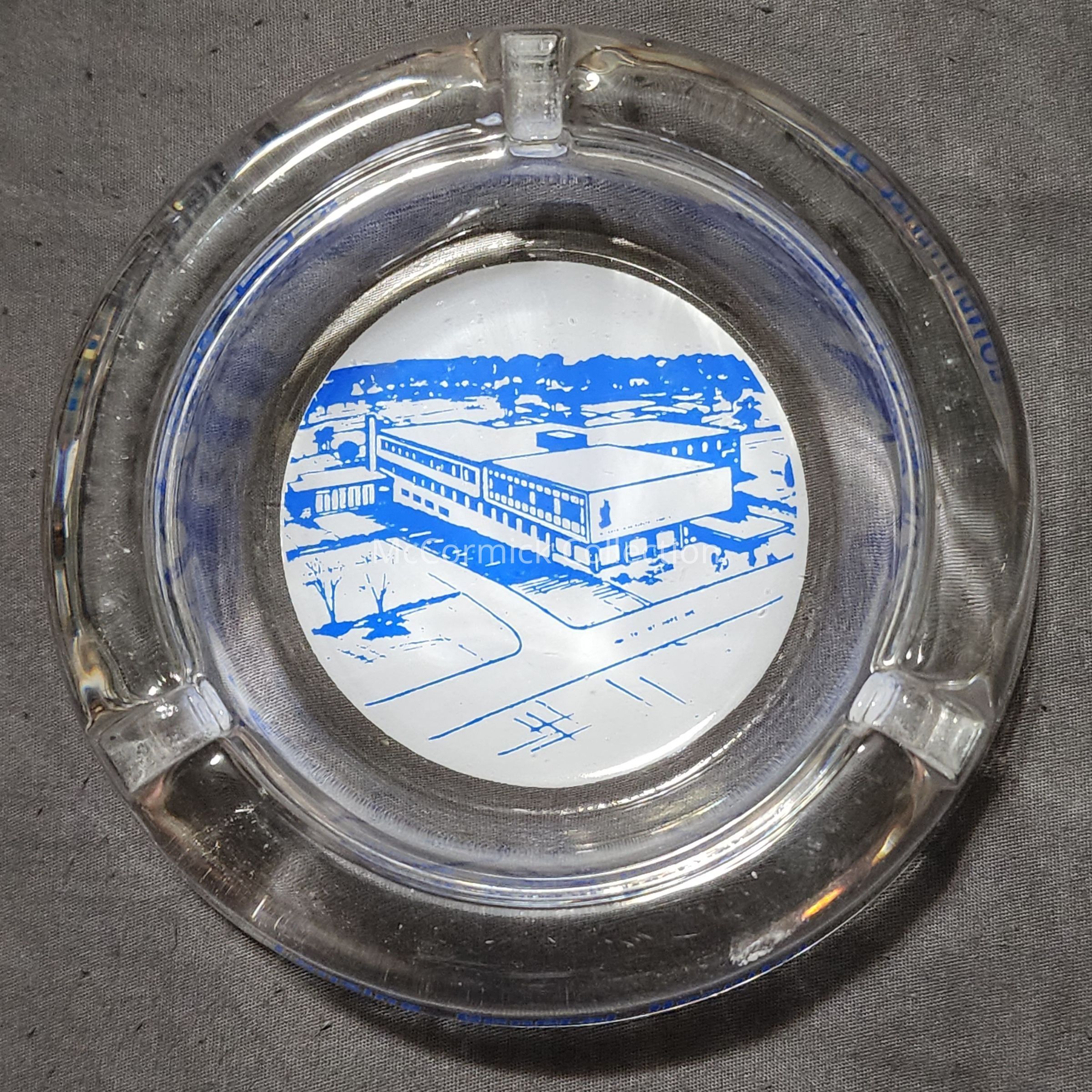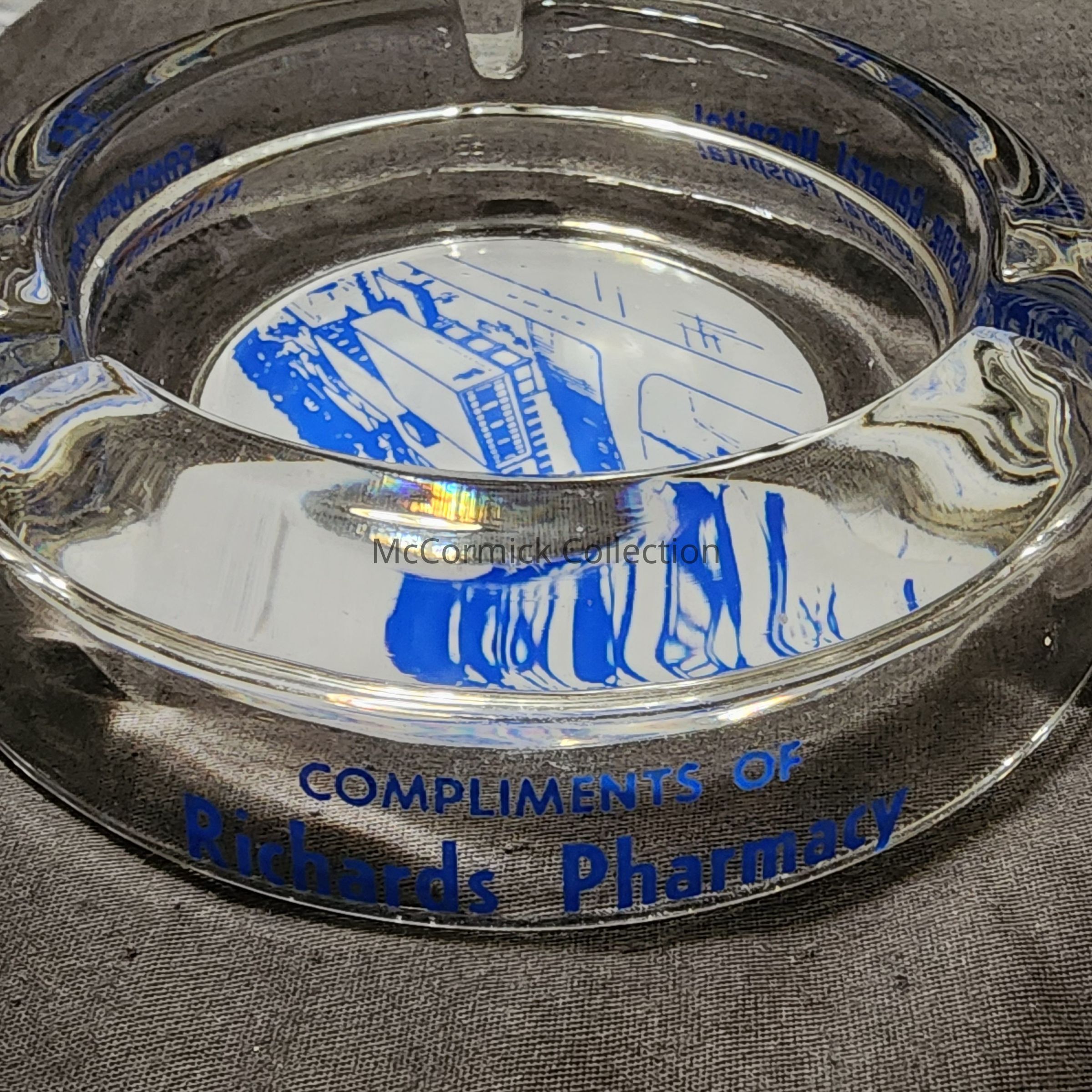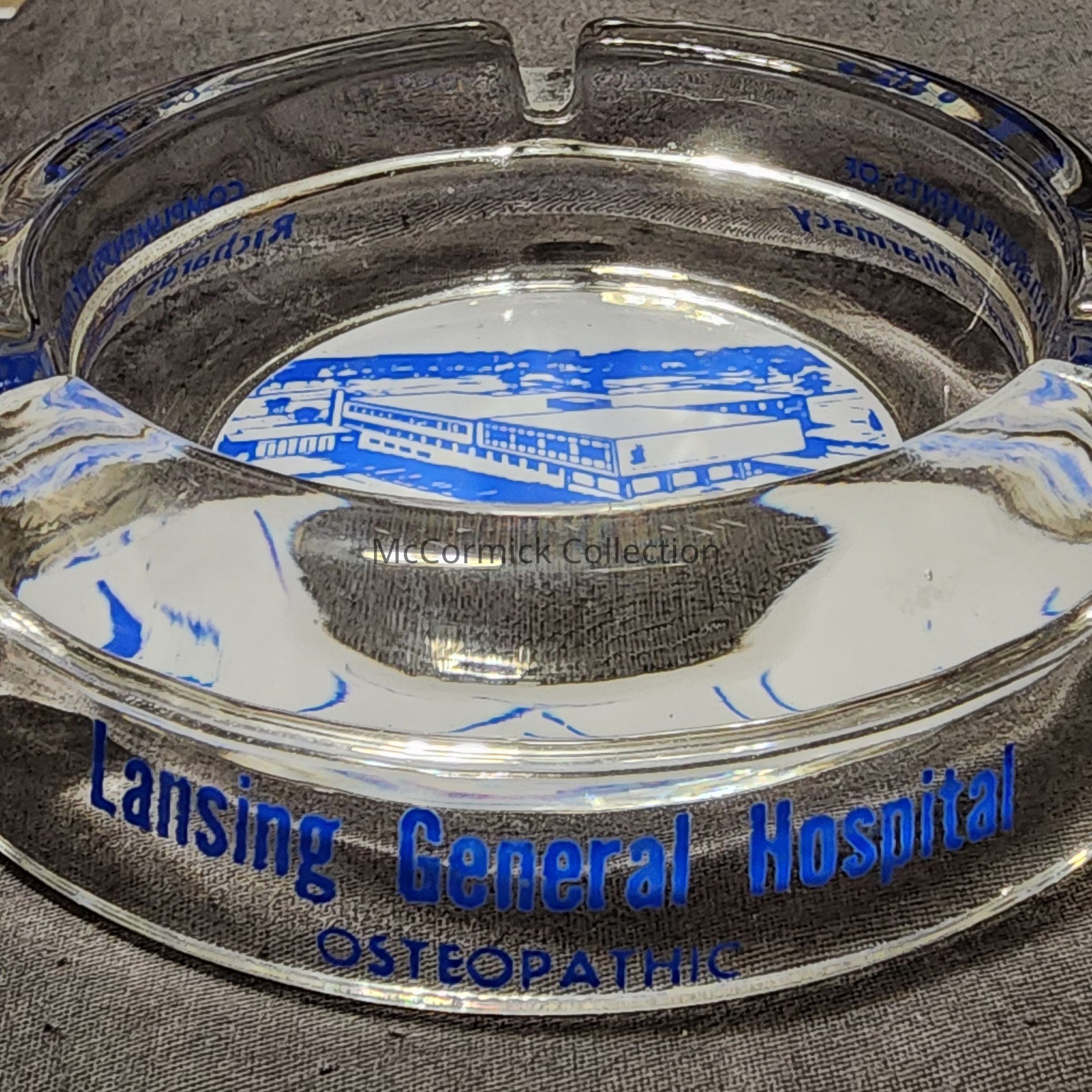 A glass advertising ashtray for Lansing General Osteopathic Hospital in Lansing, Michigan, with Richards Pharmacy advertising.