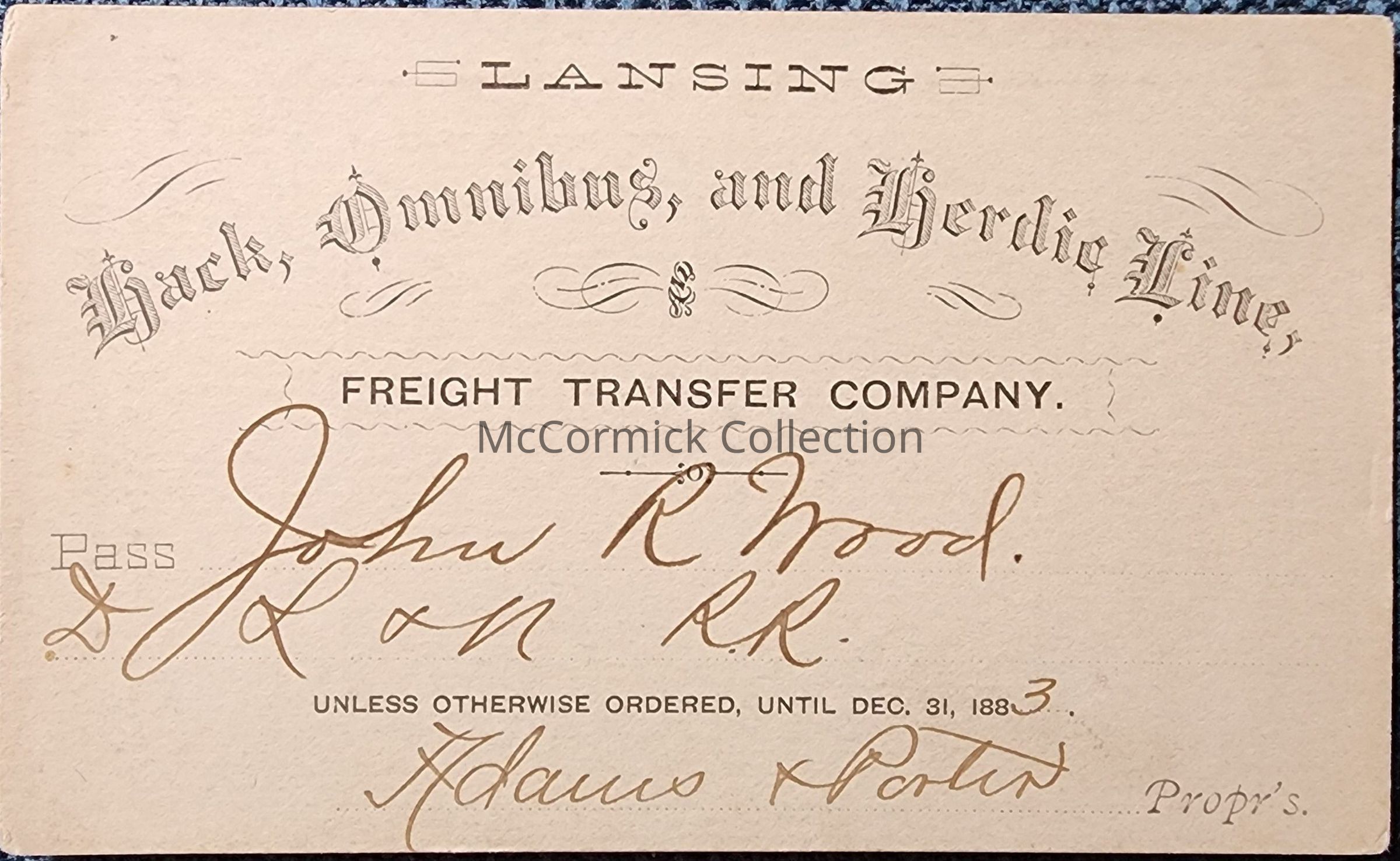 Lansing Hack, Omnibus, and Herdic Line, Freight Transfer Pass, 1883