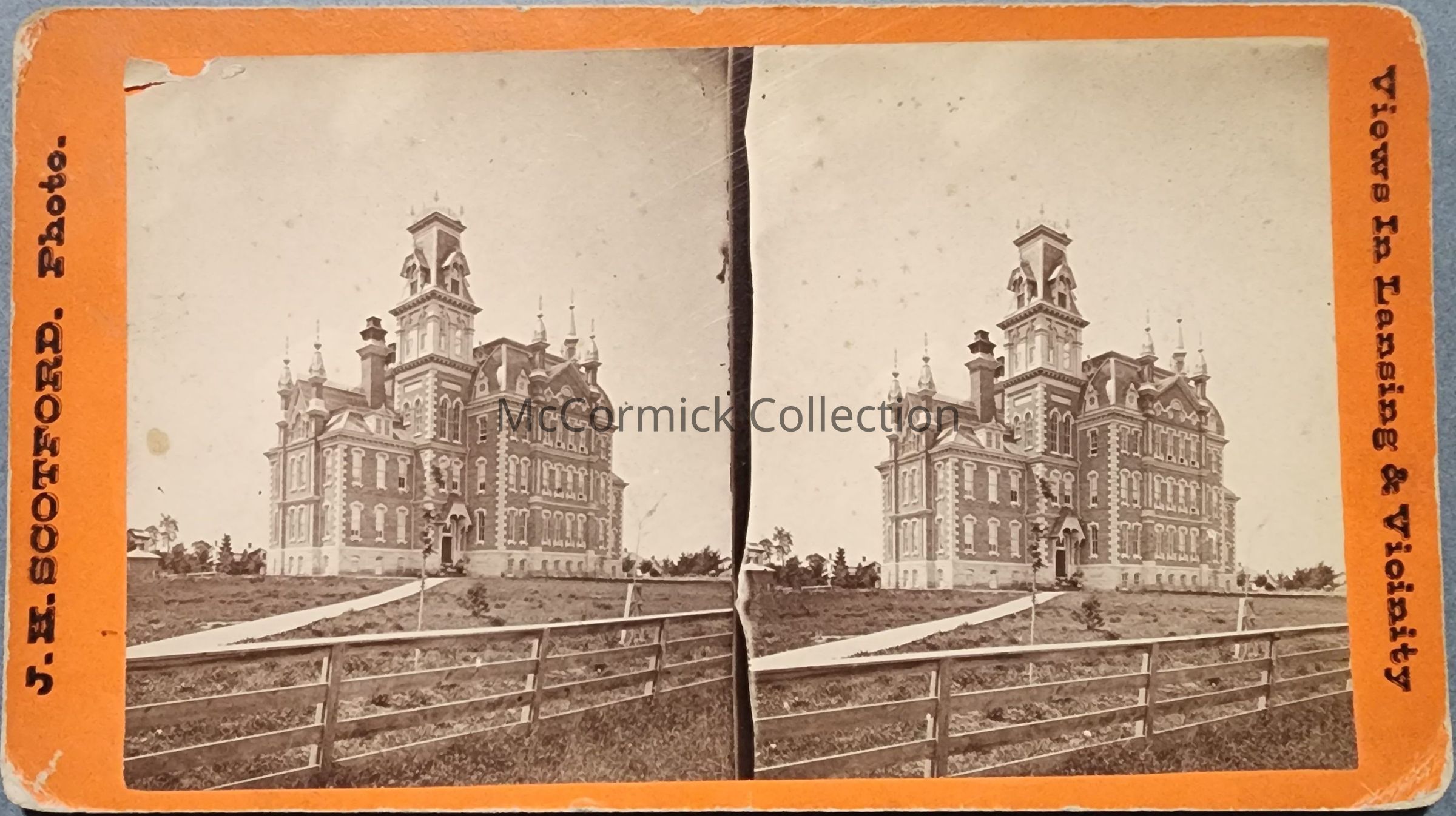 Stereograph of Lansing High School by Lansing photographer John Harvey Scotford, circa 1877-1881.