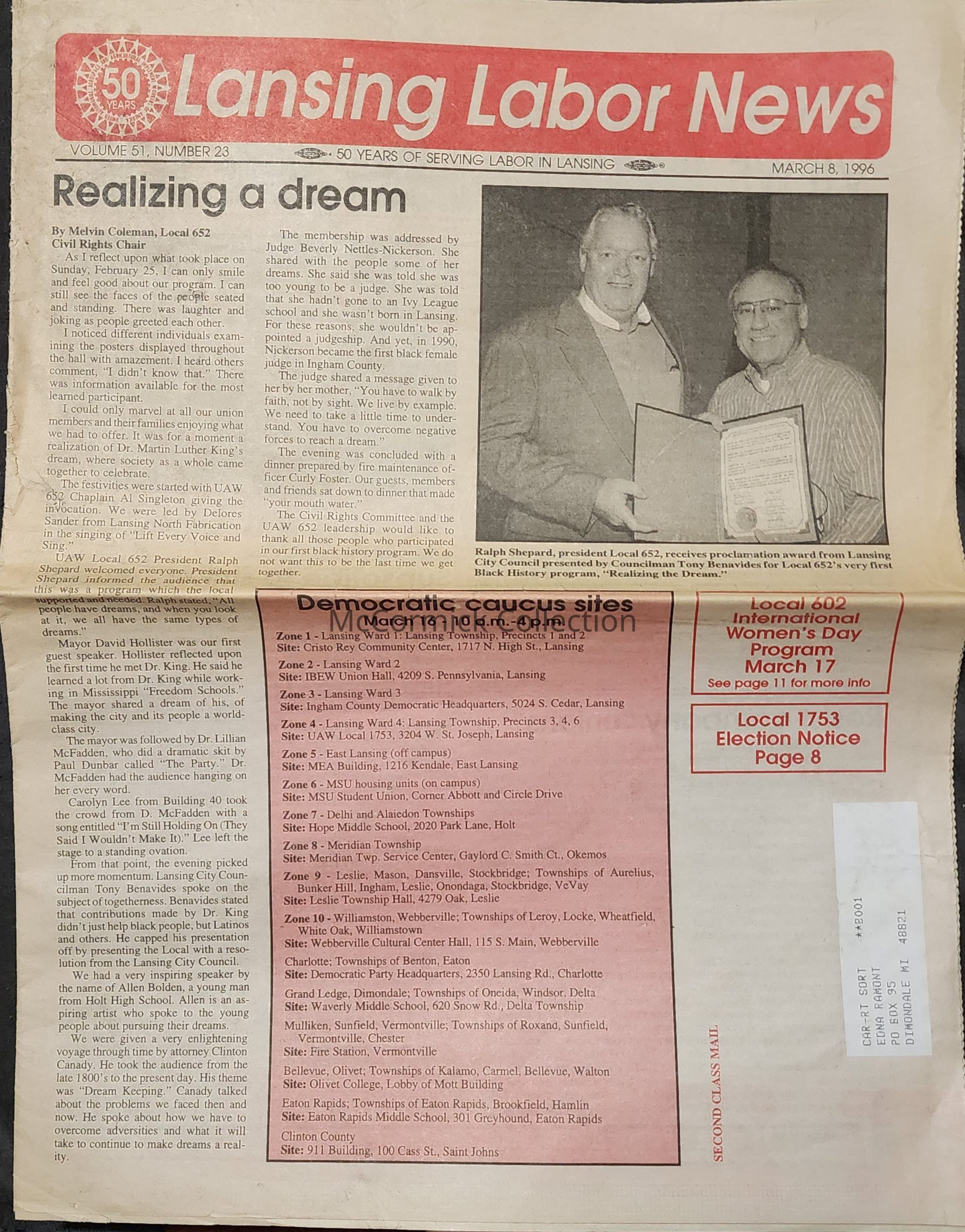 Lansing Labor News, March 8, 1996
