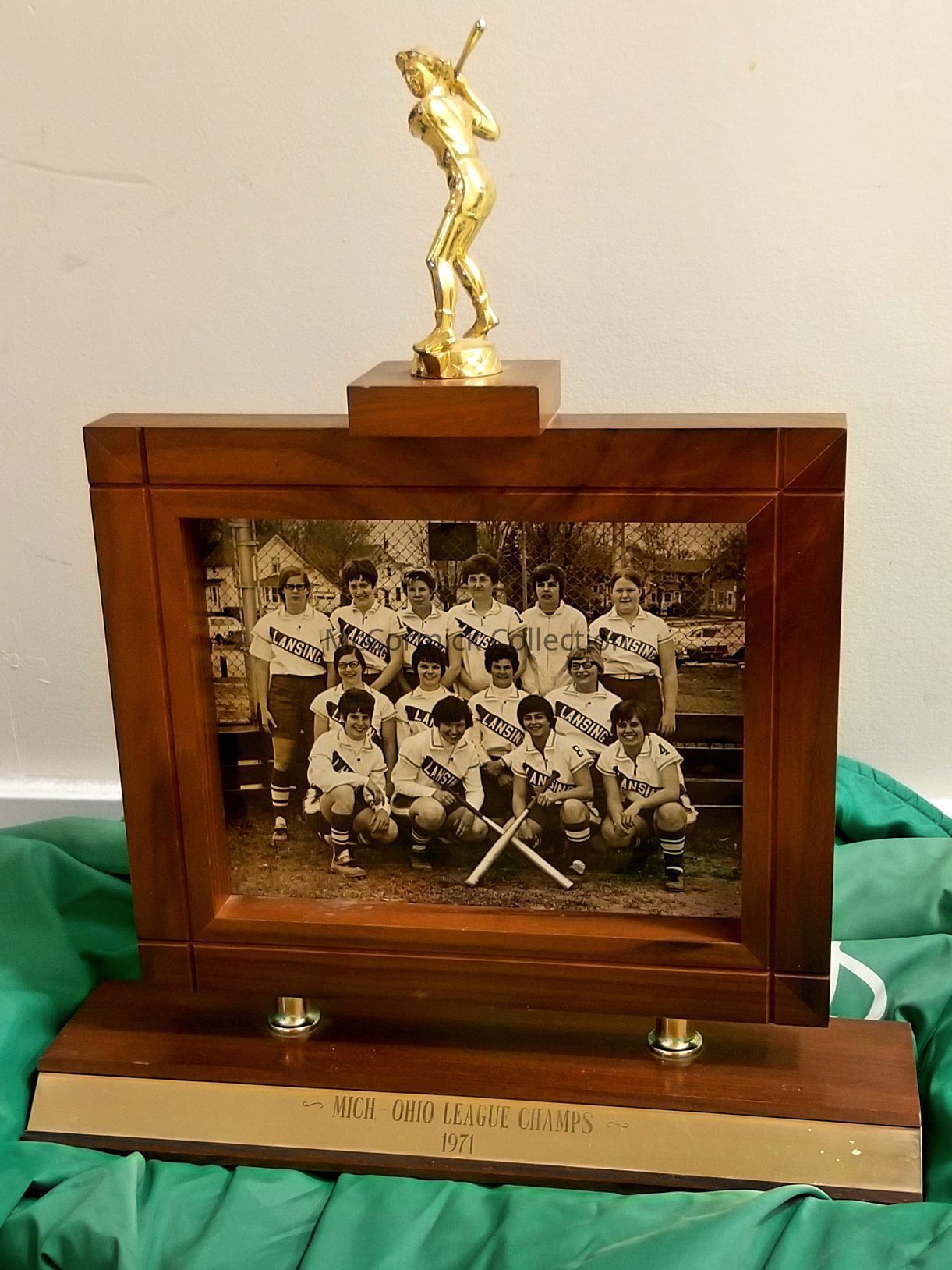 1971 Michigan-Ohio League Champions trophy with photograph from the Lansing Laurels softball team. From the Lenz Estate.