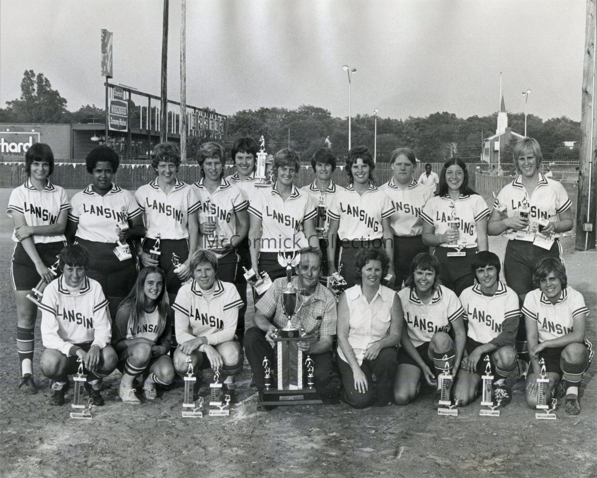 Photograph of a Lansing Laurels softball team, taken in Frandor with the Eberhard store in the background. From the Lenz Estate.