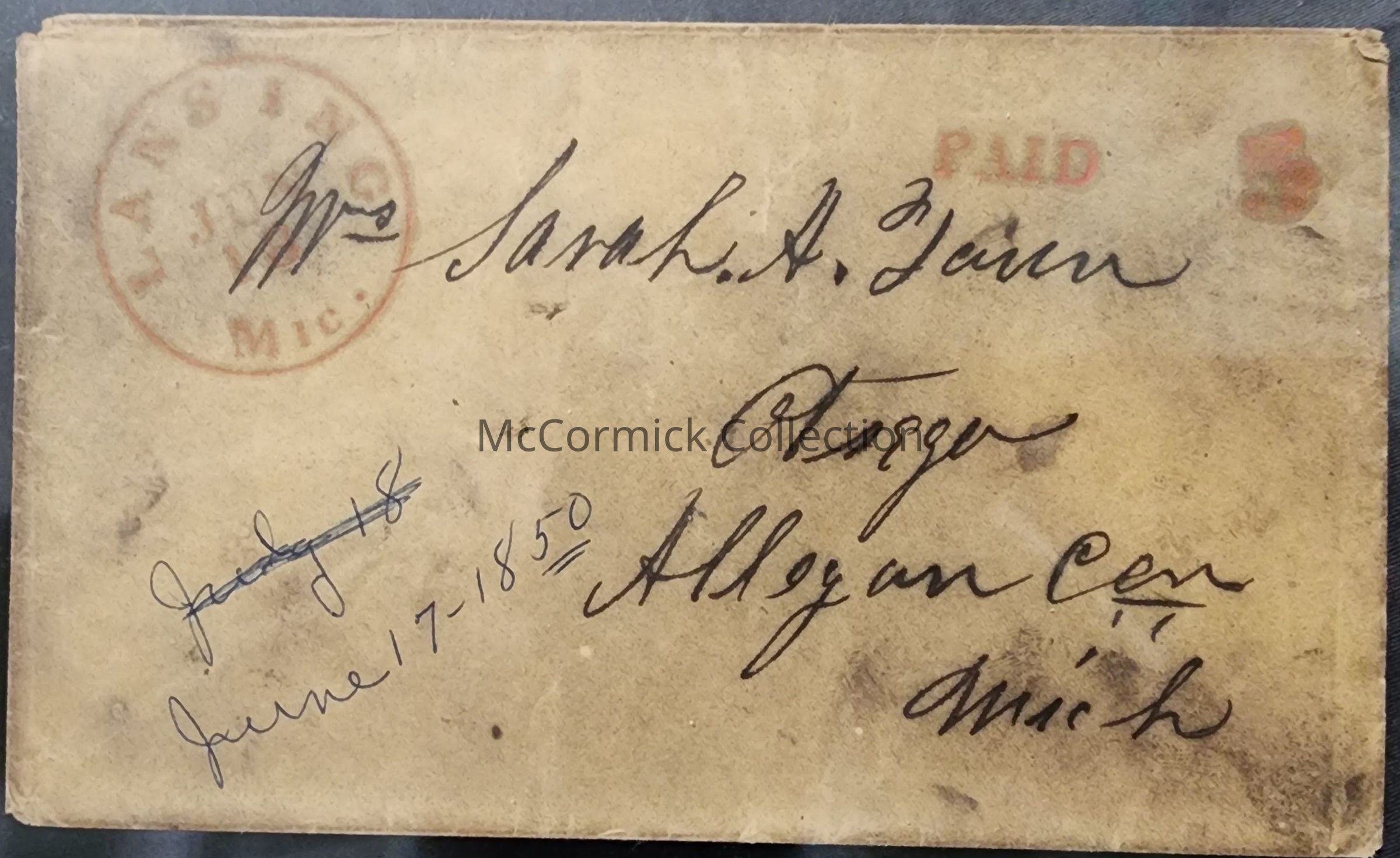 A circa 1850 postmarked envelope postal cover from Lansing, Michigan to Allegan County, Michigan.