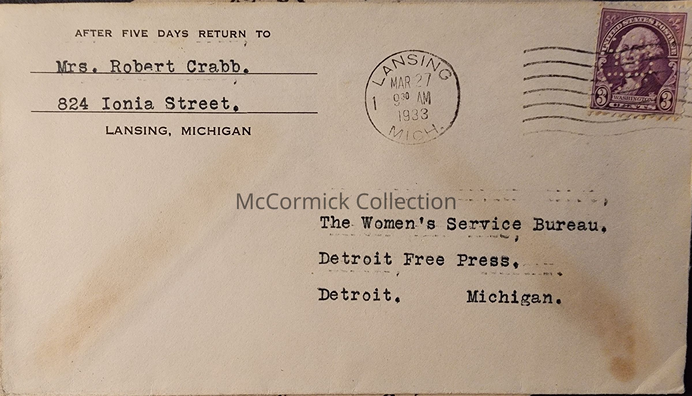 Lansing, Mich., 1933, Postal Cover