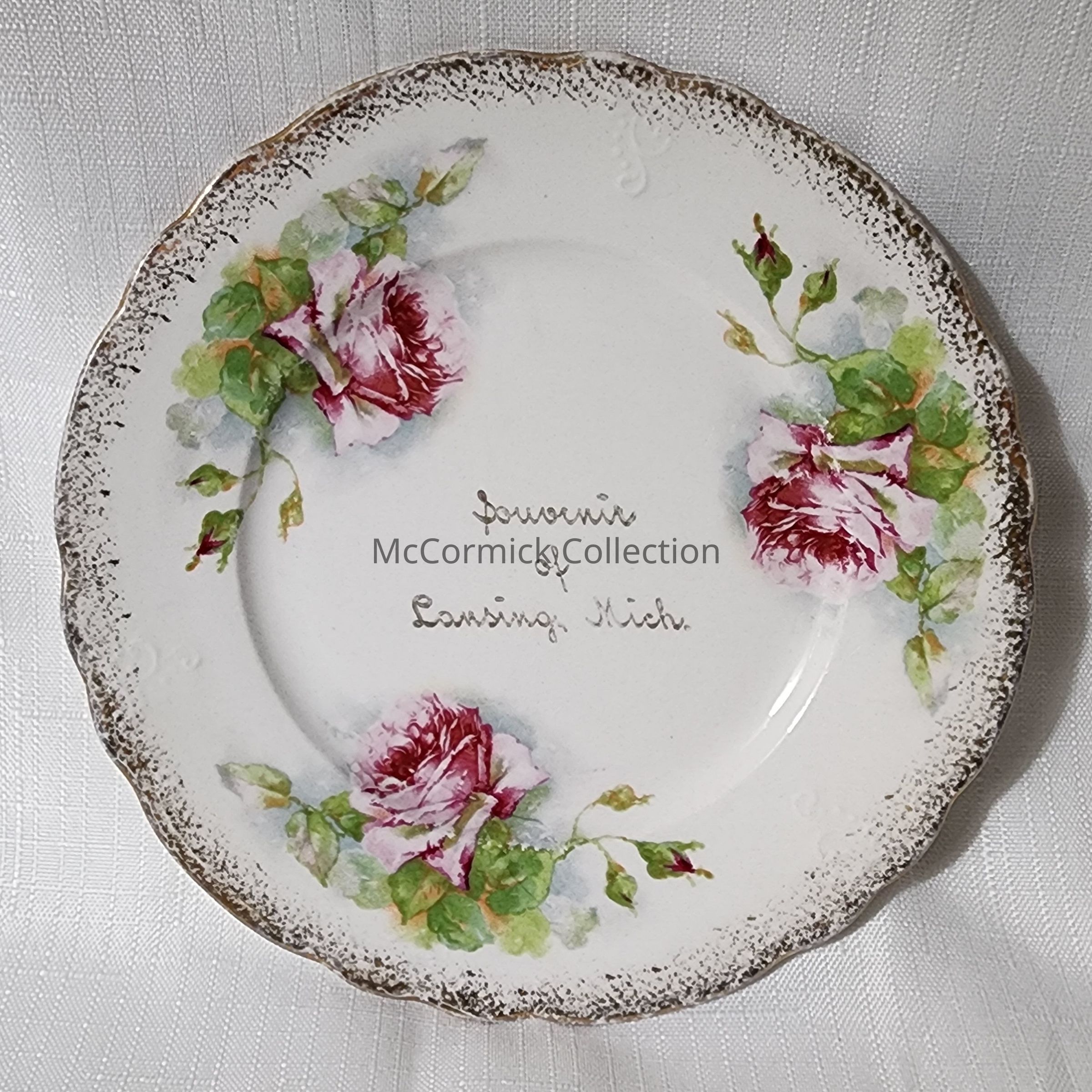 A ceramic Souvenir Plate with floral designs from Lansing, Michigan.