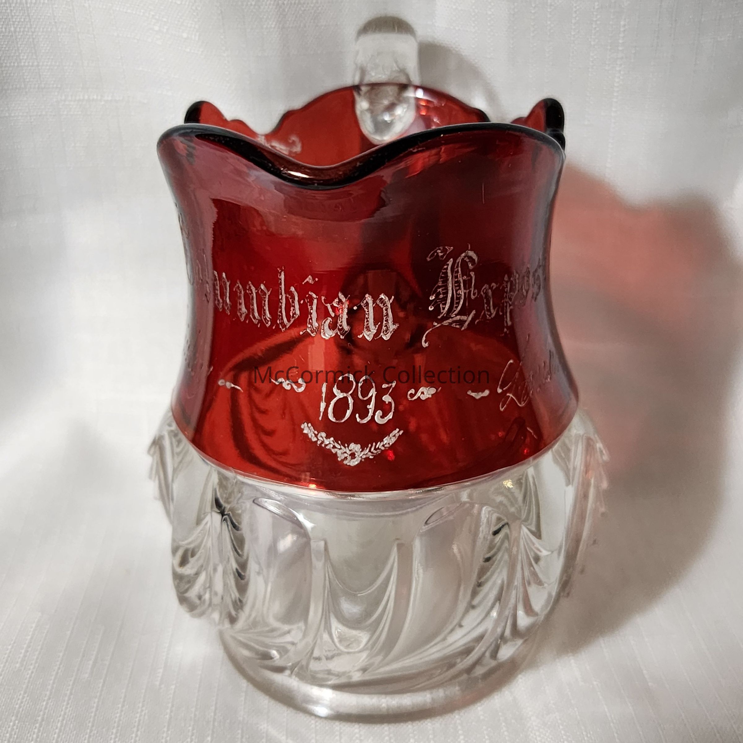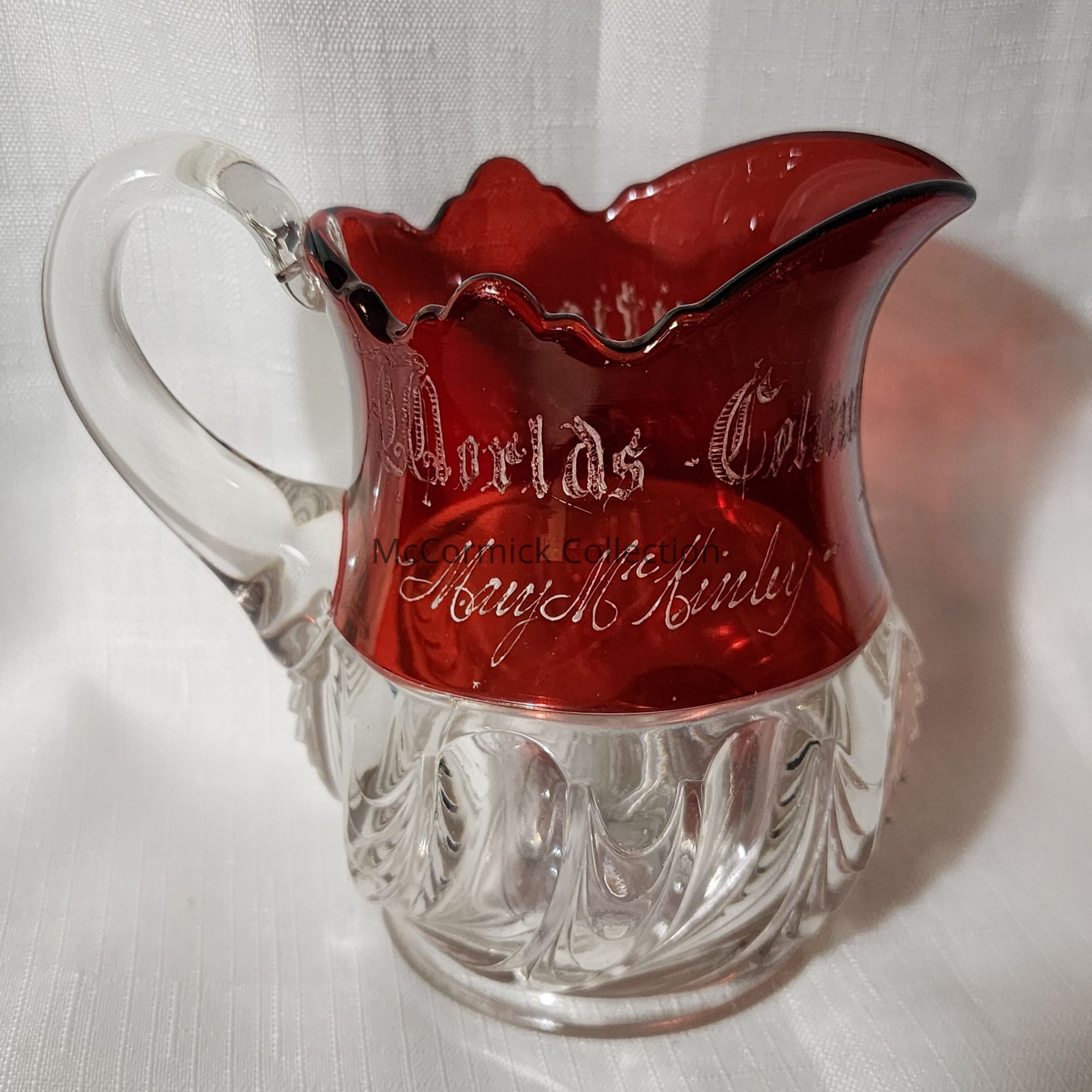 May McKinley inscribed ruby red flashed glass souvenir pitcher from the World's Columbian Exposition and also labeled Lansing, Mich., circa 1893.