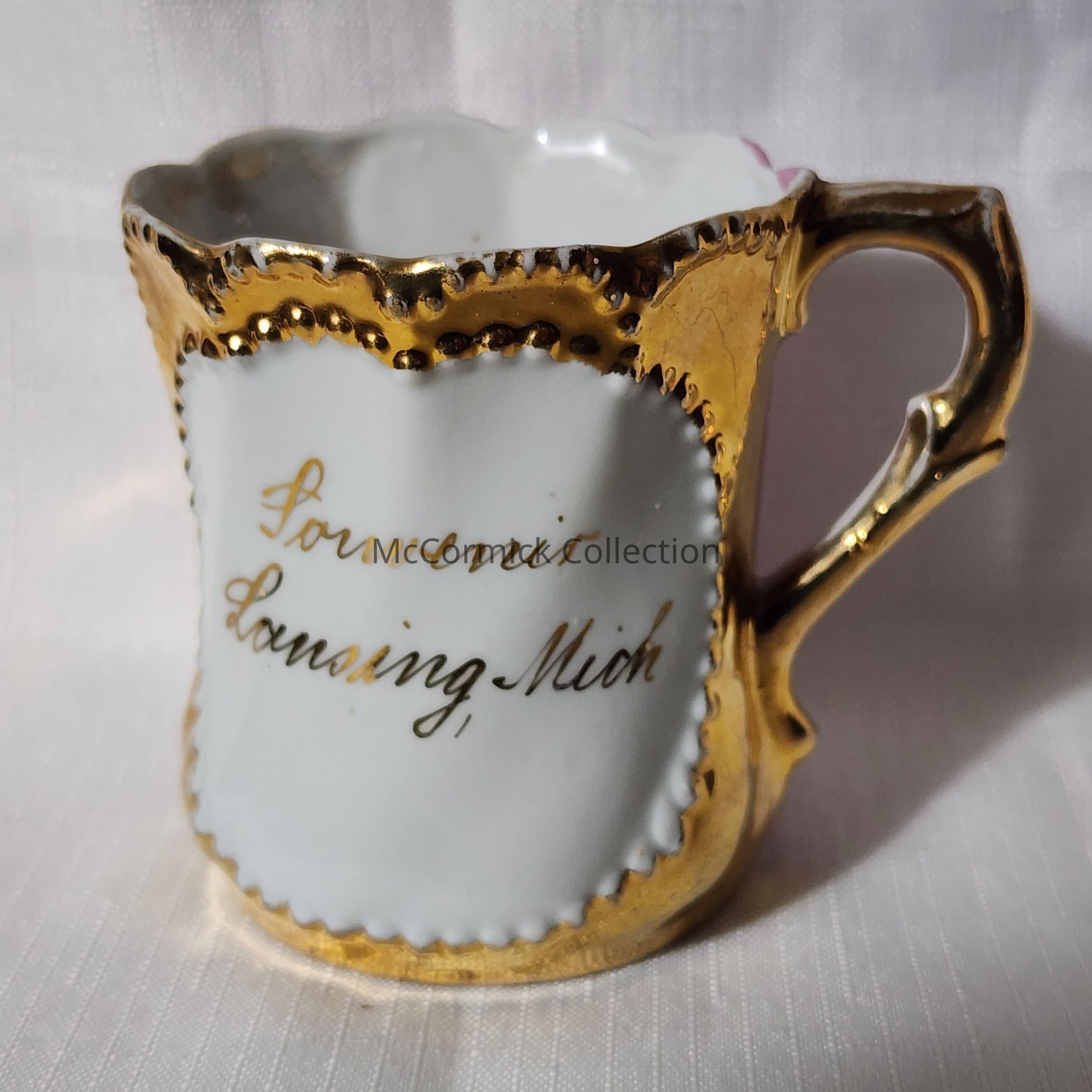 Porcelain souvenir cup in gold and pink from Lansing, Michigan.