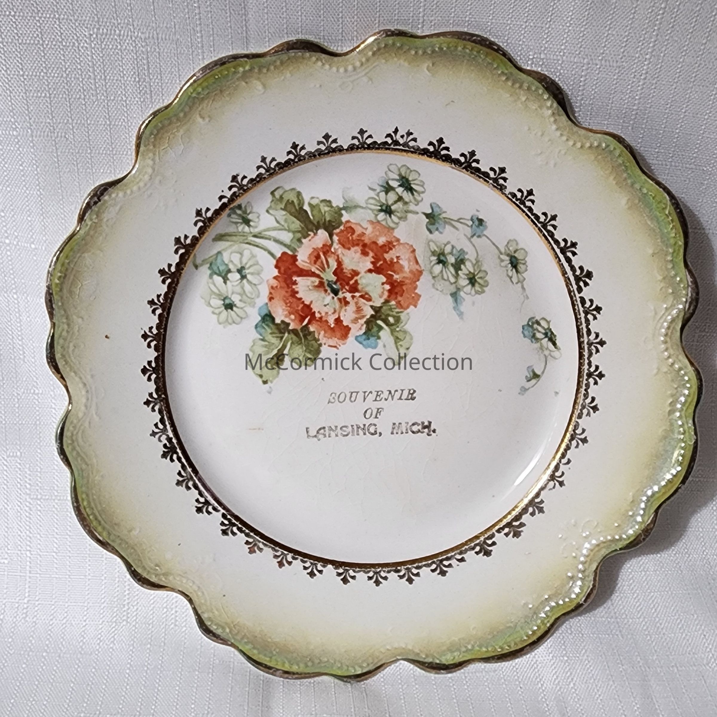 Porcelain souvenir plate from Lansing, Michigan, with scalloped edge and floral design.