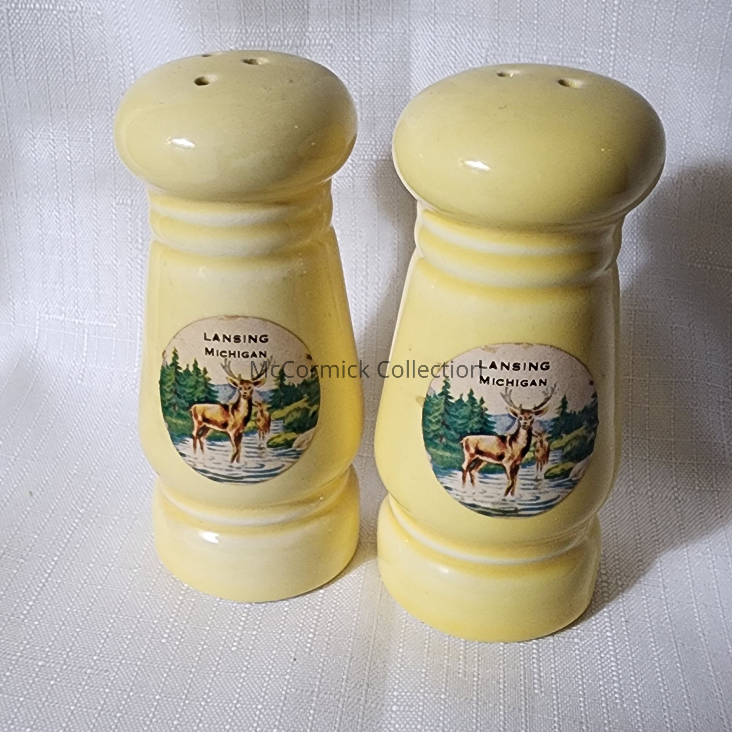 A pair of yellow salt and pepper Shakers with deer themed decals, souvenirs of Lansing, Michigan.