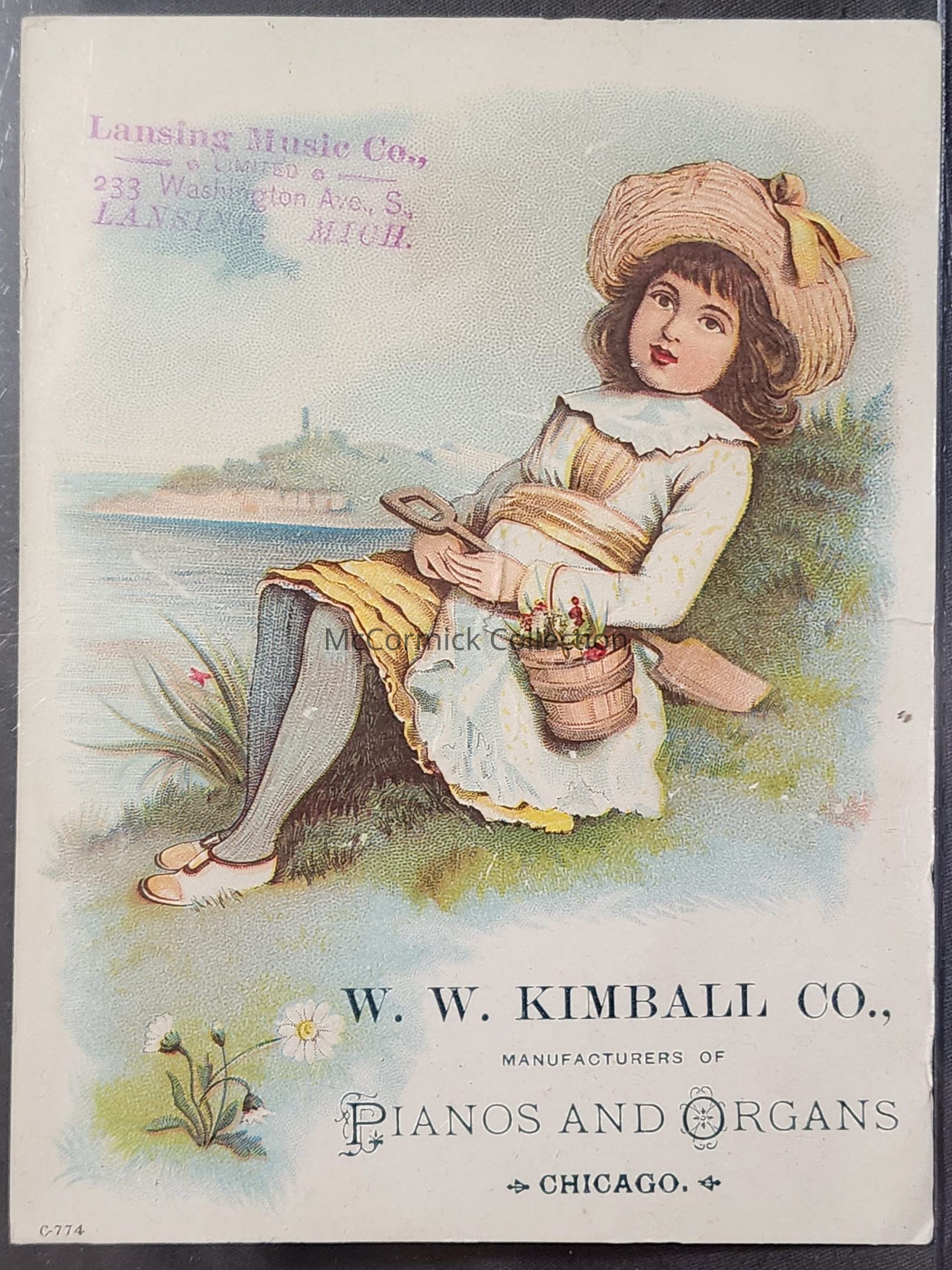 A W.W. Kimball trade card stamped by the Lansing Music Co.