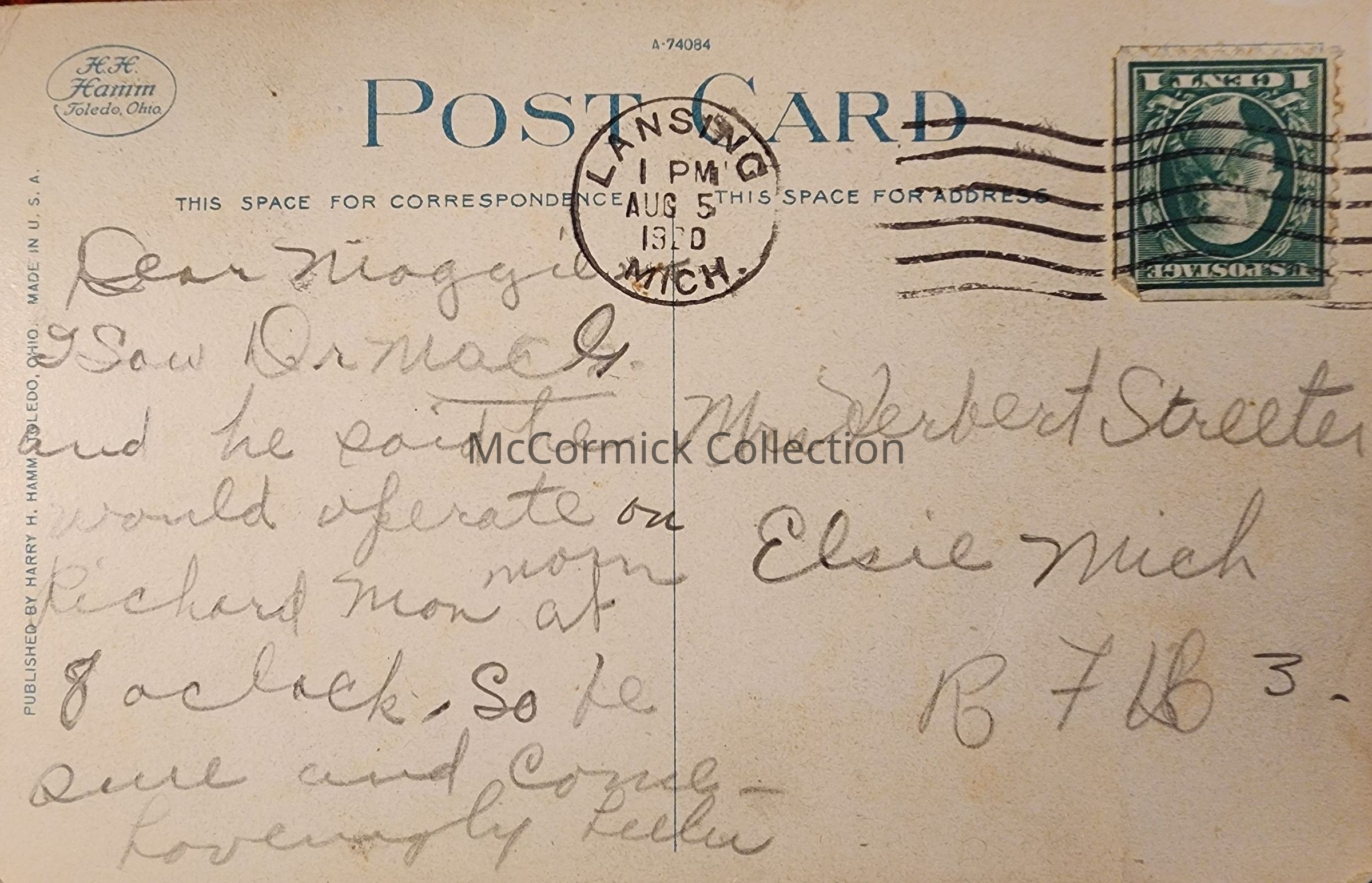Postally used, Lansing 1920 postmark.