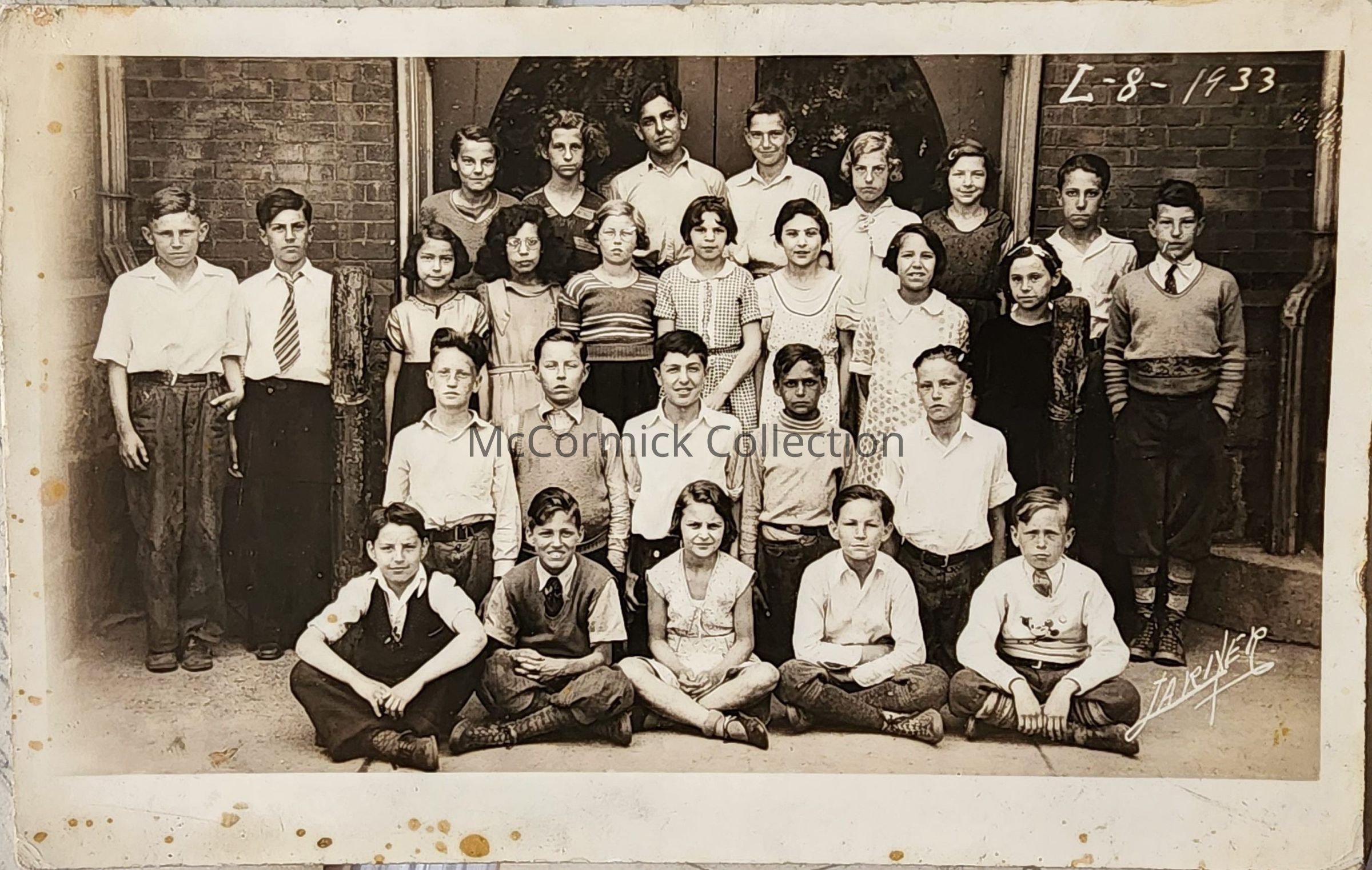 Real photo postcard of a Larch Street School class, code is L-8-1933, by Lansing photographer Larner.