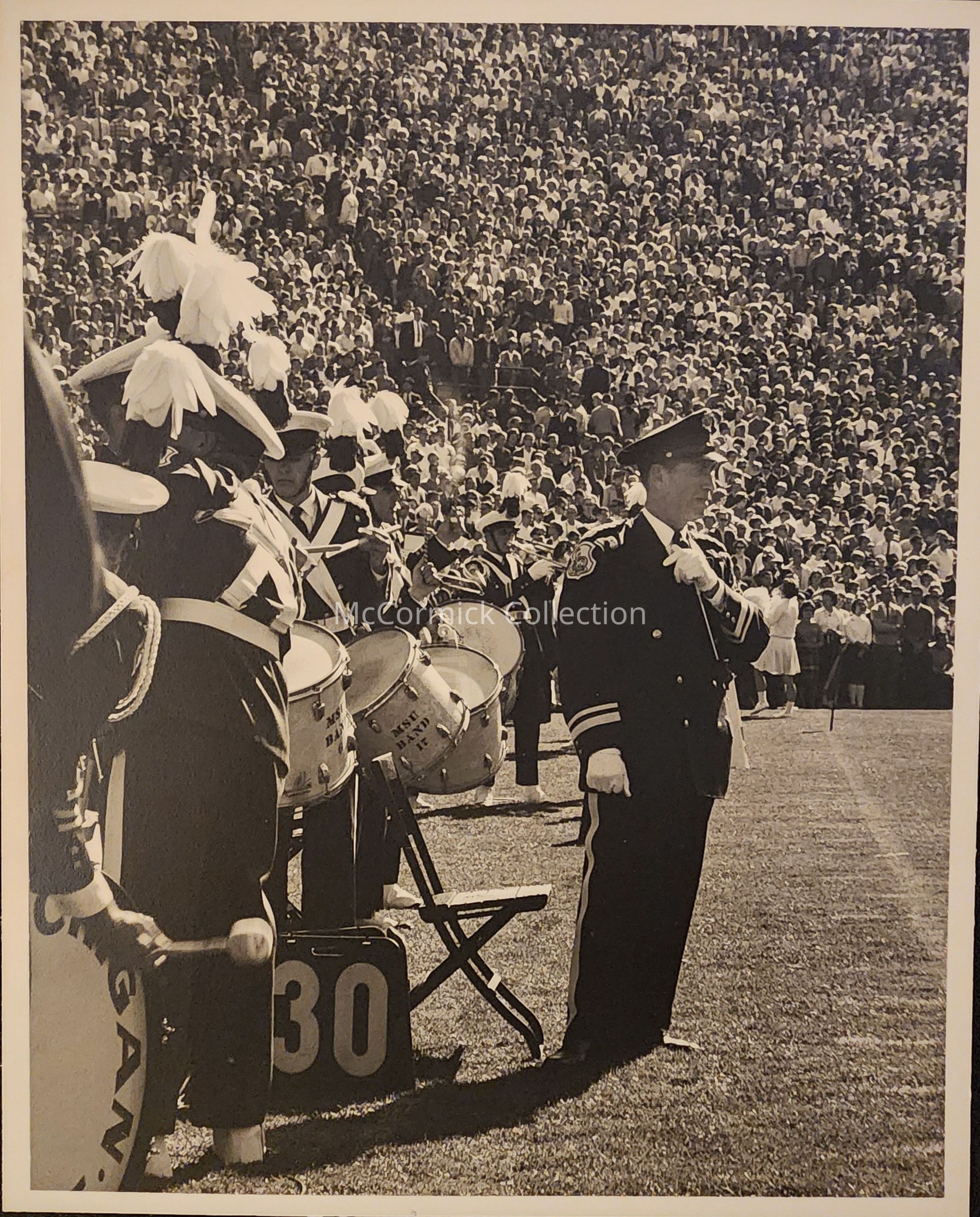 Photographic print of Leonard Falcone and the Michigan State University Spartan Marching Band on the sideline of a football game at Spartan Stadium in East Lansing. Dated Fall 1963.