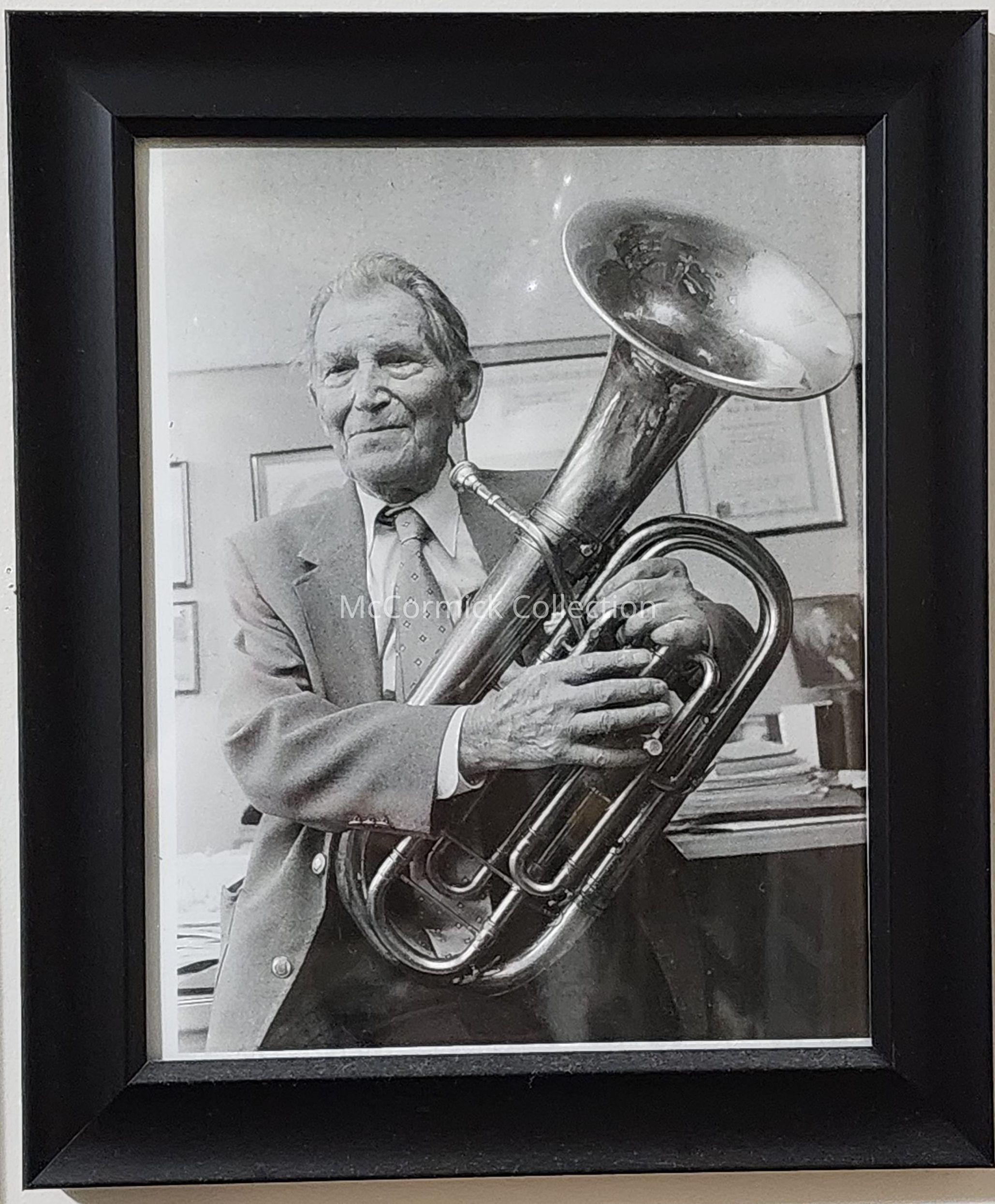 Framed Photo of MSU Director of Bands Emeritus Leonard Falcone with his baritone in his office. Press photograph.