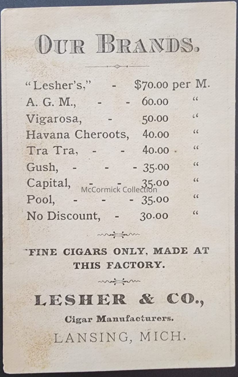 Trade card for Lesher & Co., cigar manufacturers, Lansing, Michigan.