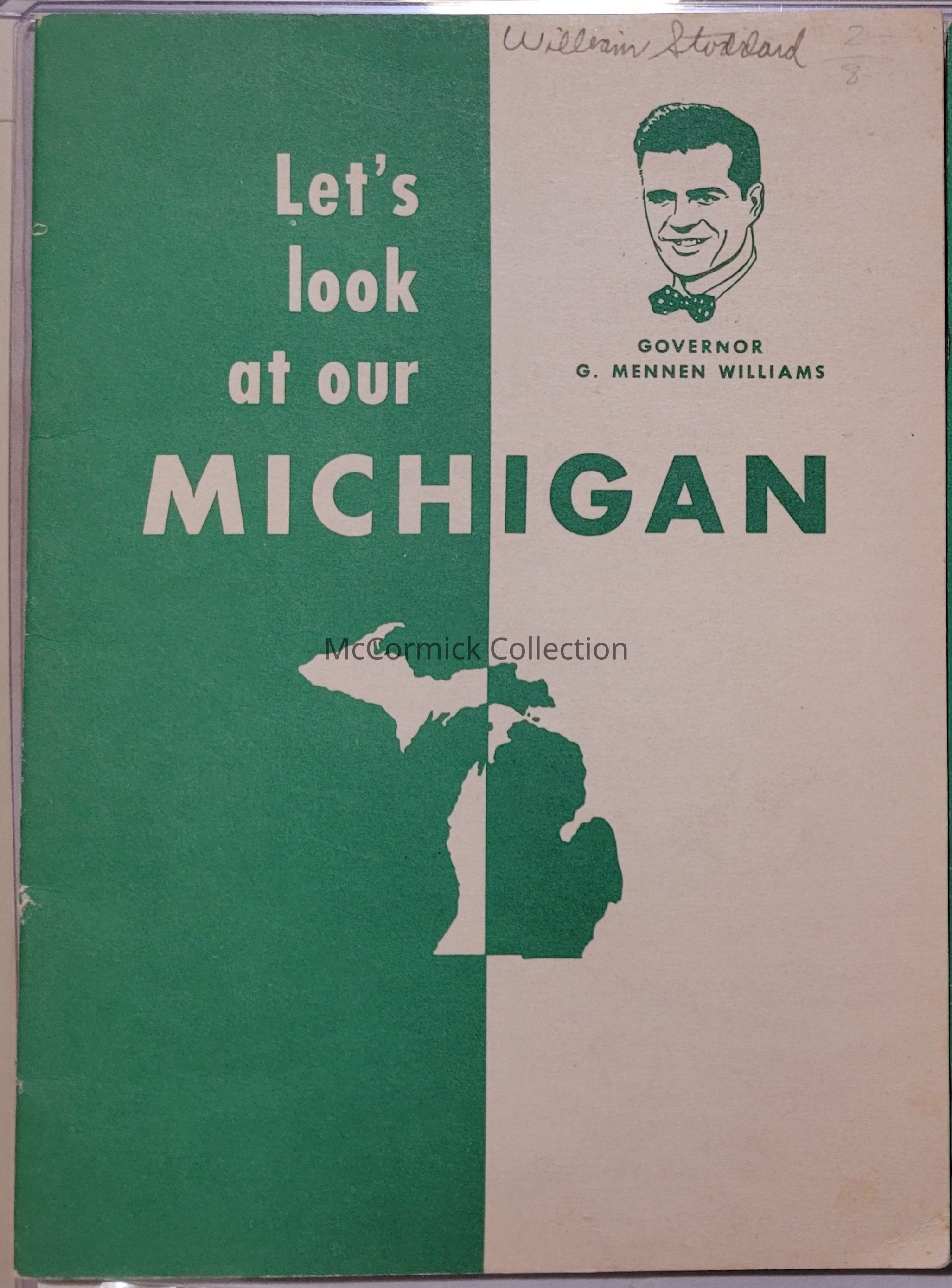 A green and white booklet from Governor G. Mennen Williams titled "Let's look at our Michigan." Dated 1953.