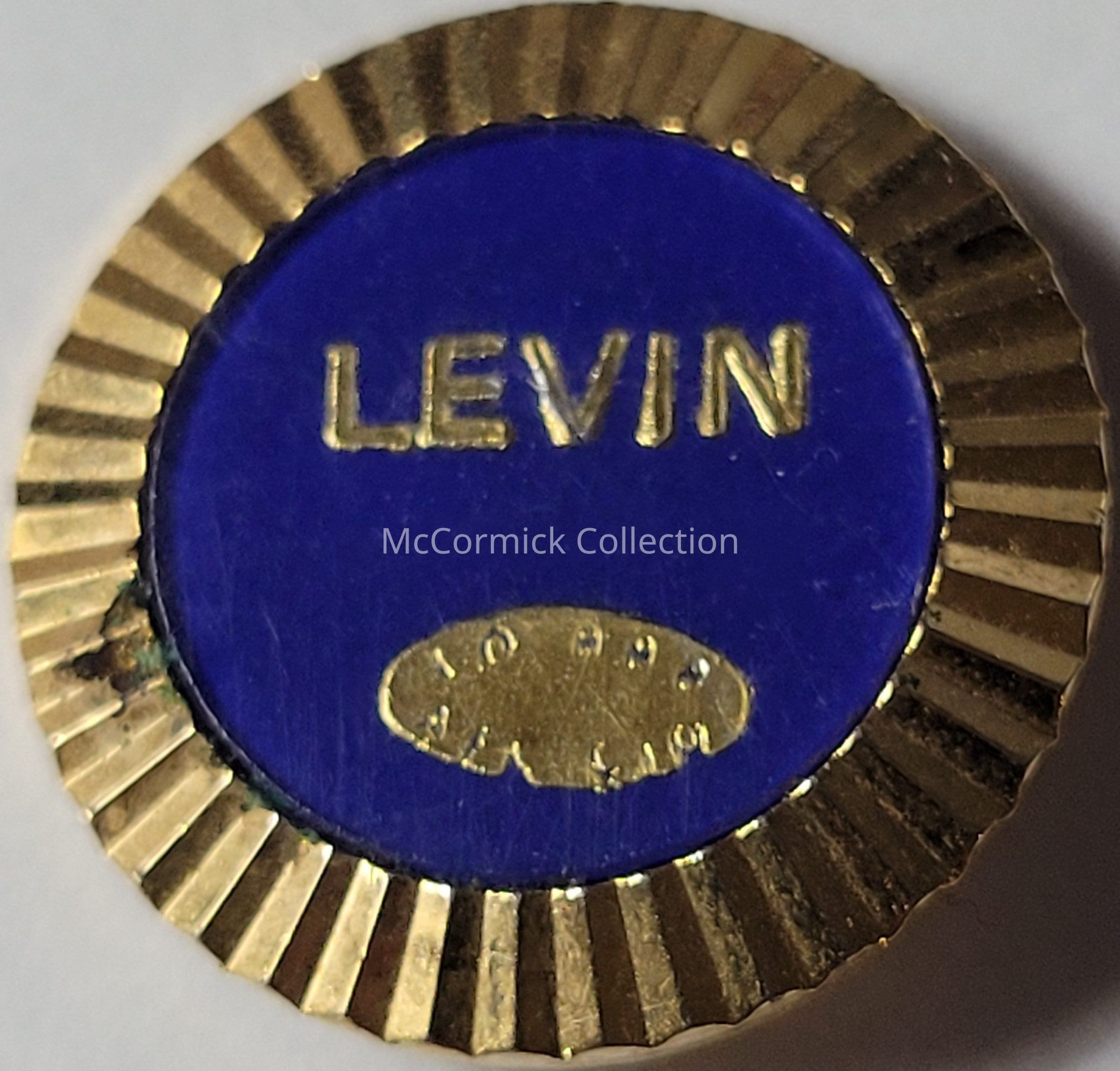 A blue and gold pin for Levin, either Carl or Sander, with an AFL-CIO tag, circa 1970s.