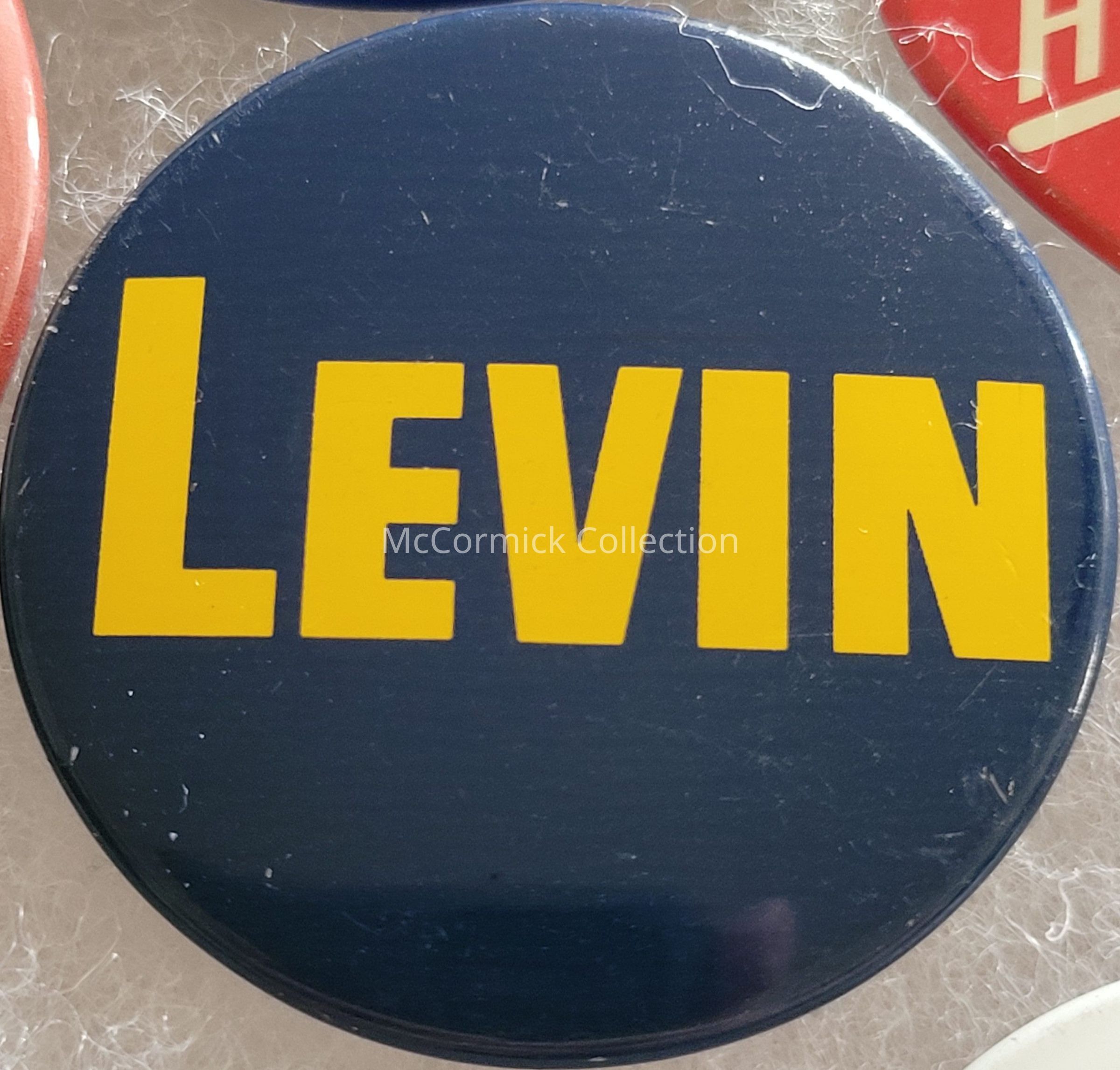 A circa 1990s blue and yellow button for Carl Levin for U.S. Senate.
