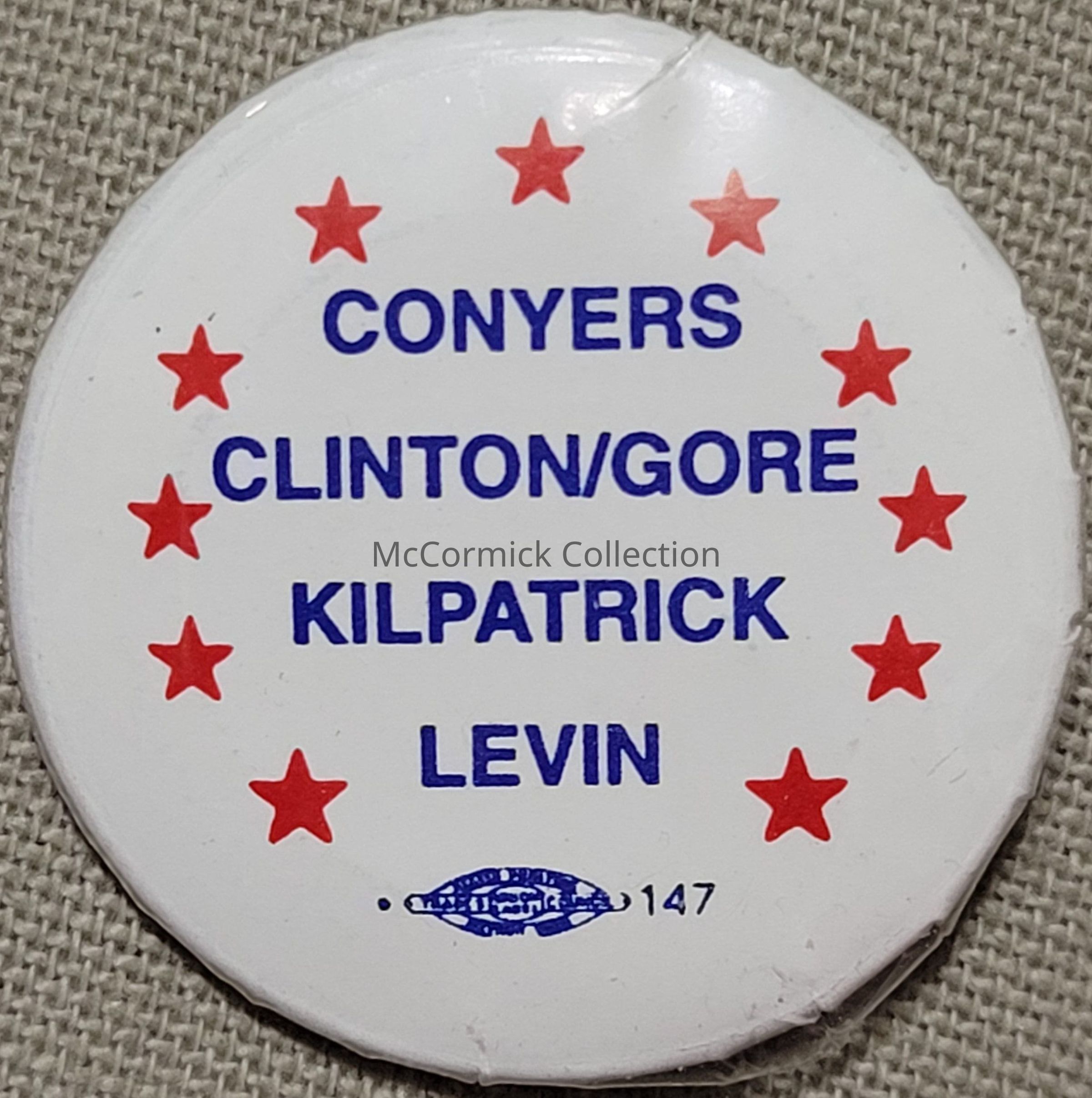 Red, white, and blue coattail button for John Conyers for U.S. Congress, Bill Clinton for President, Al Gore for Vice President, Kilpatrick for a local or state office, and Carl Levin for U.S. Senate. Circa 1990s.