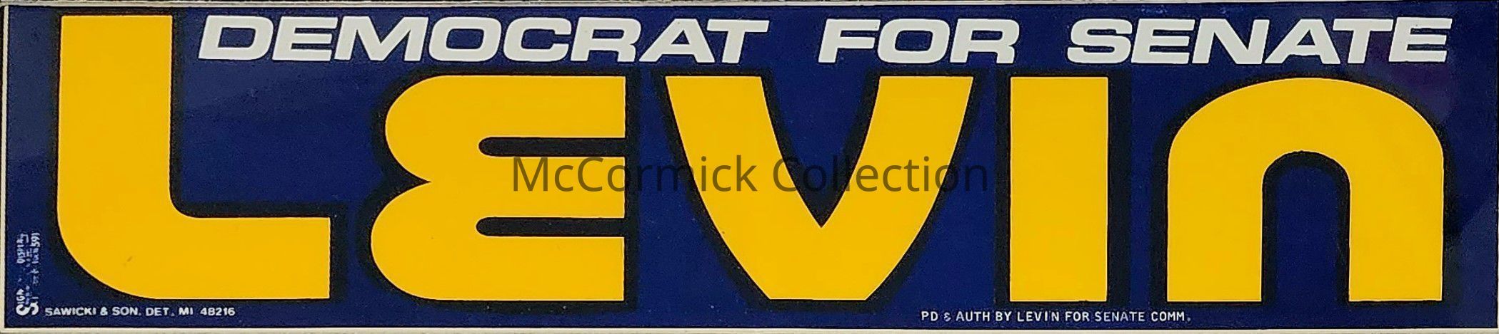 A blue, white, and yellow bumper sticker for Carl Levin for U.S. Senate, reads: "Democrat for Senate / Levin." Circa 1970s.
