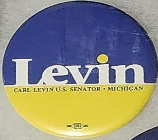 A 2.25 blue, yellow, and white political button for Carl Levin, reading "Levin / Carl Levin U.S. Senator Michigan."