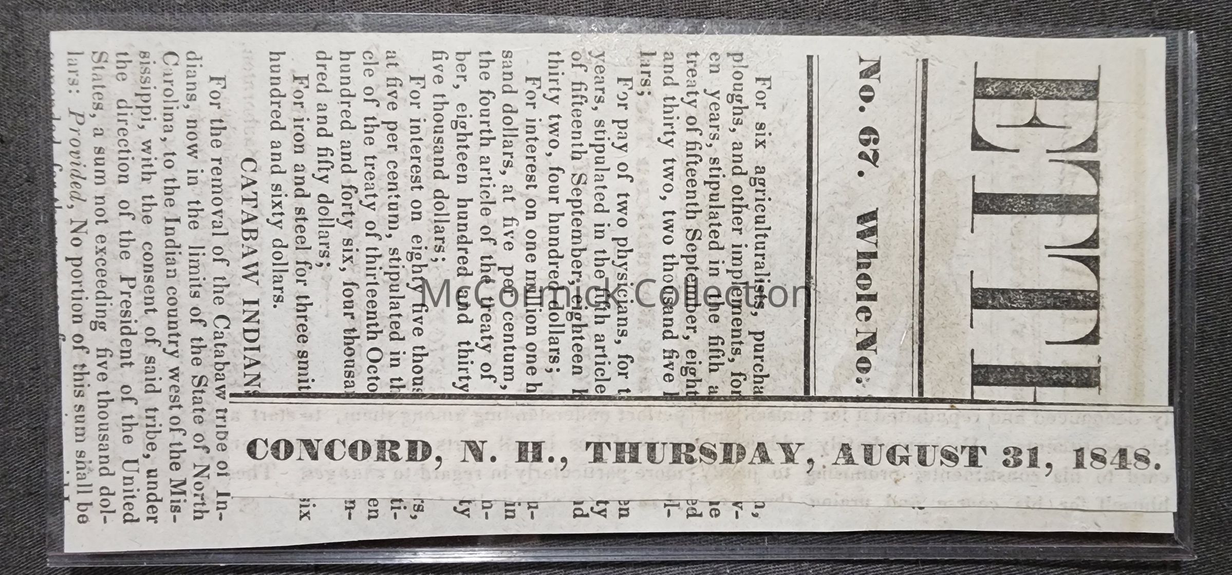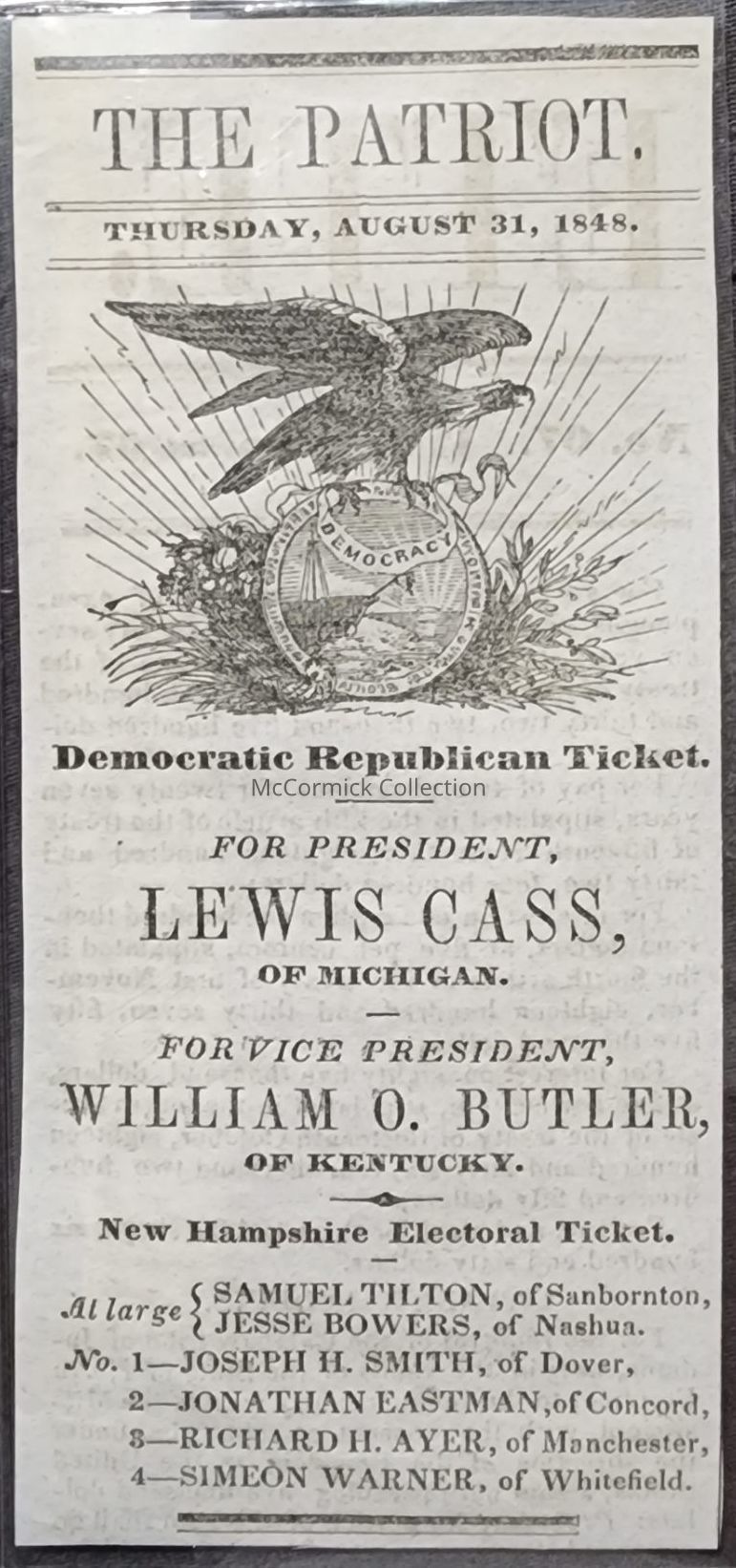 Newspaper ballot ticket clipping from the Concord, New Hampshire "Patriot," August 31, 1848, for the Lewis Cass - William O. Butler ticket for President and Vice President, Democratic ticket.