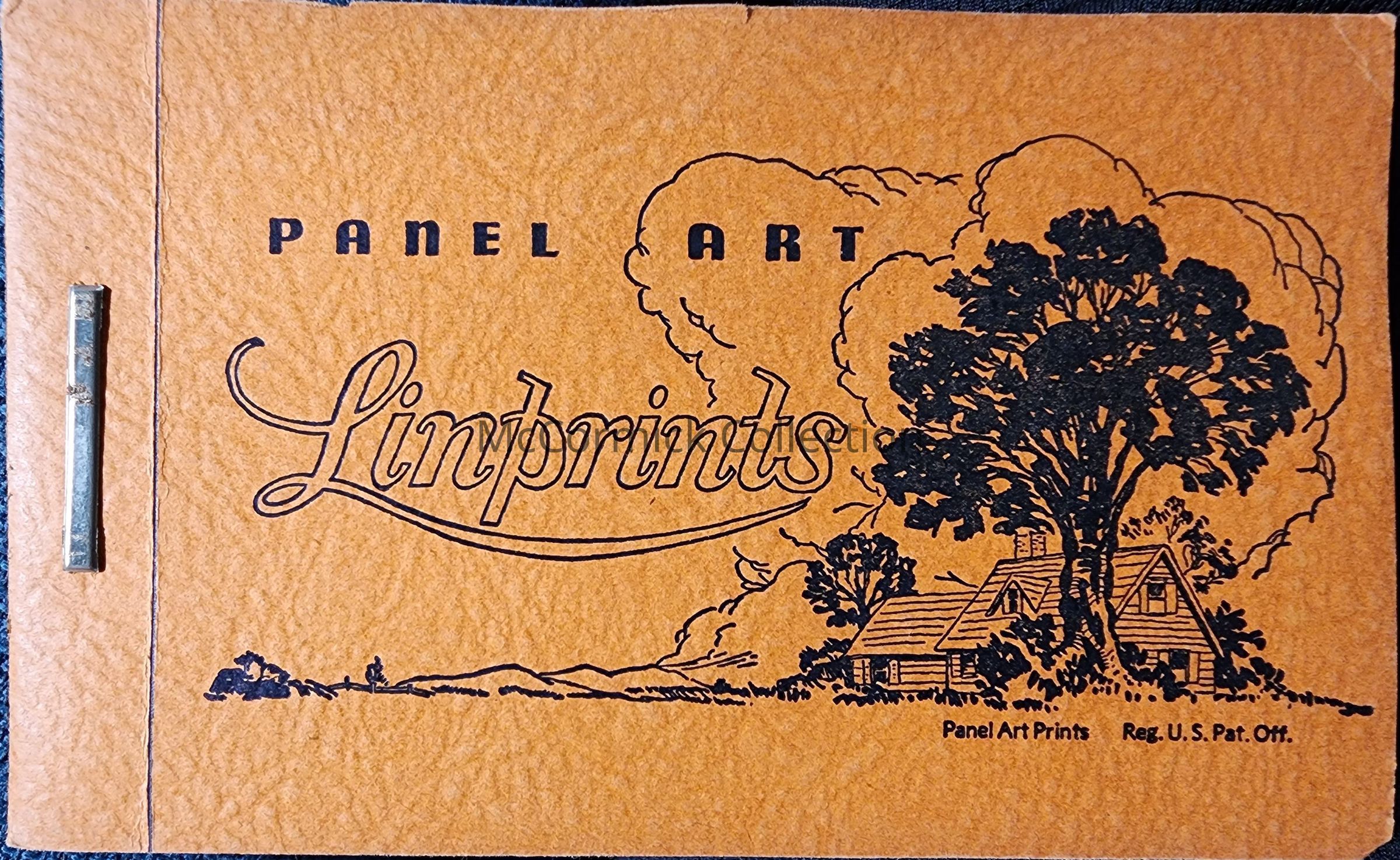 Orange Linprints folder of snapshots of a brick house cottage, possibly Houghton Lake, Michigan. Includes an Adams, Mello Crisp, advertising trailer.