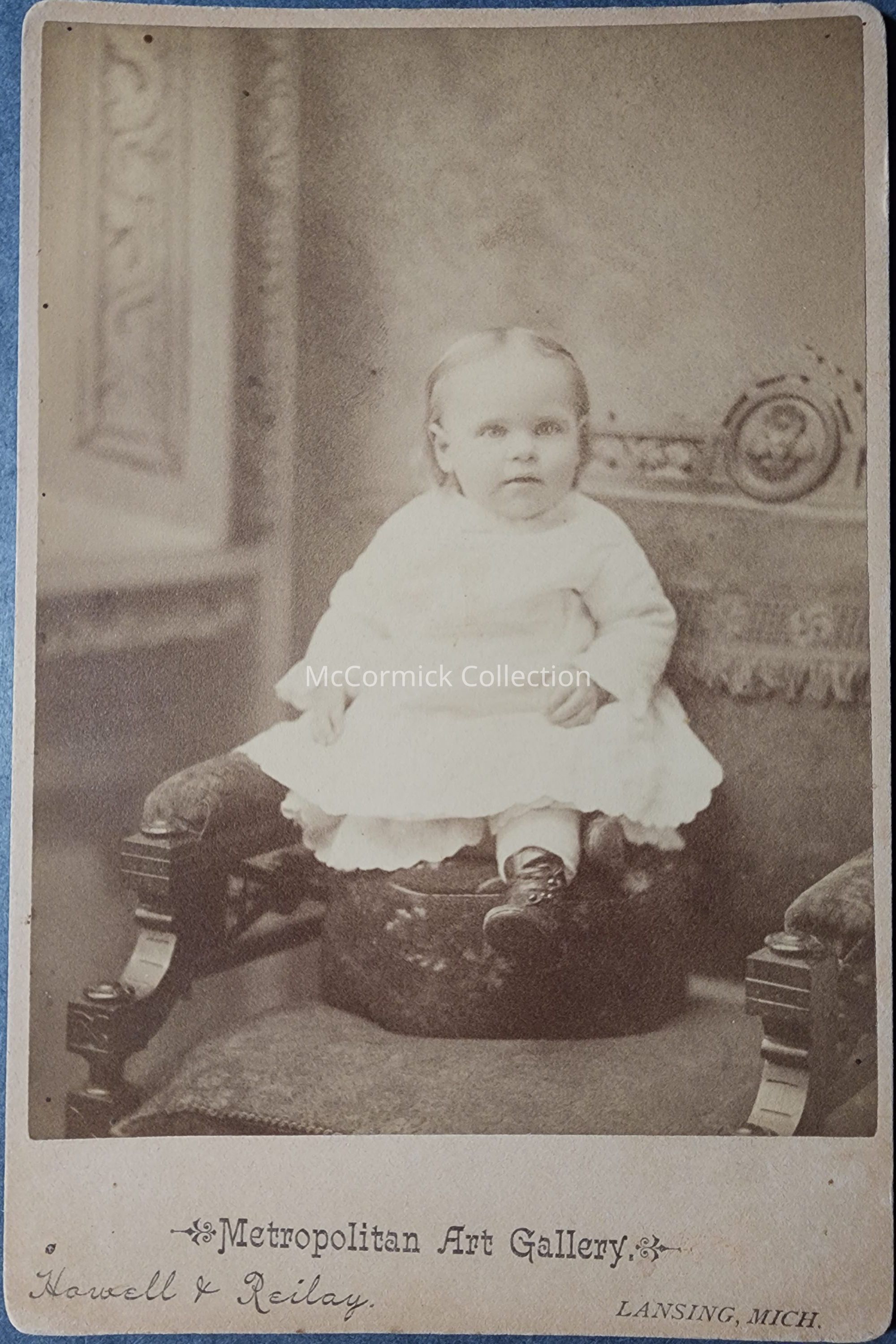 Cabinet card photograph of Lois Chase by Howell and Reilay, Metropolitan Art Gallery, circa 1880s. Lois Chase was the elected treasurer of the City of Lansing. Two copies. Chase Collection.