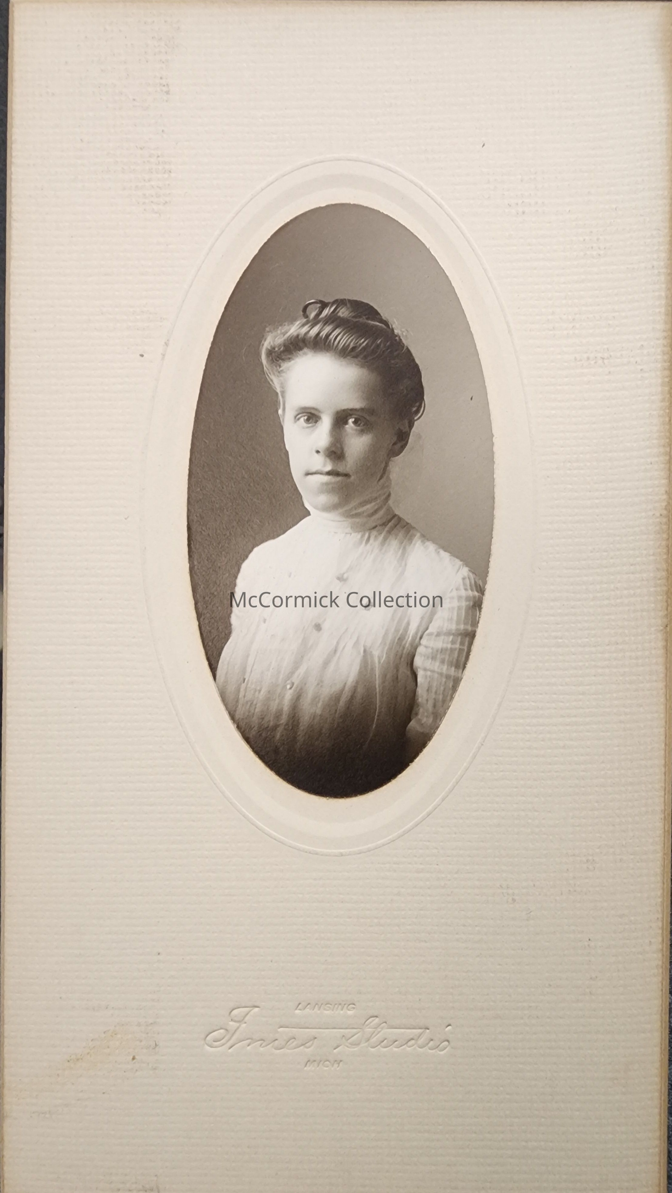 Card mounted photograph of Lois Chase by Lansing photographer Imes. Lois Chase was the elected treasurer of the City of Lansing in 1925-1926, 1929-1930, and 1933-1934. She was the third woman to hold elective office in the City of Lansing. She was a longtime city and county employee when not in office. From the Chase Collection.