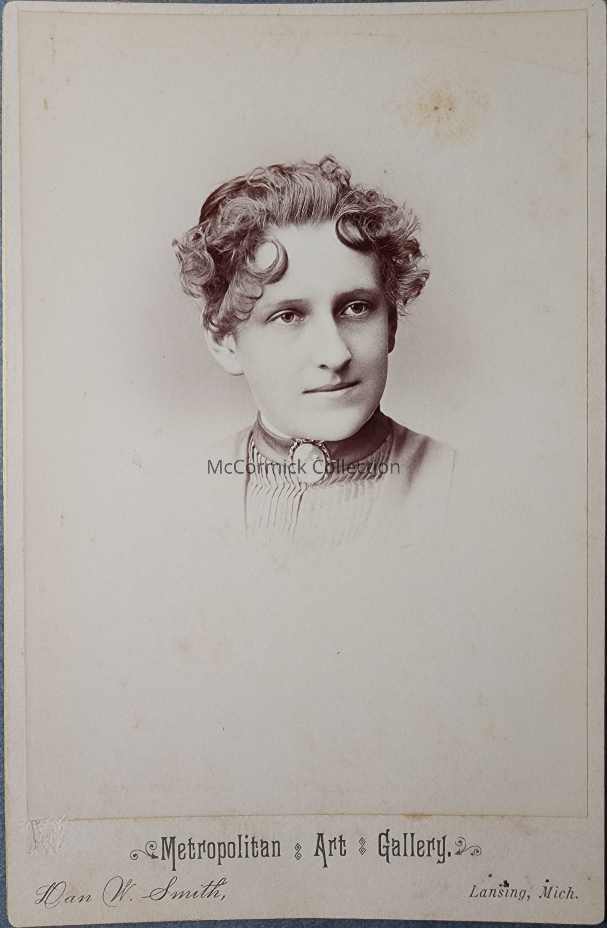 Cabinet card photograph of Lola M. Carrier, possibly an MAC student, by Lansing photographer Metropolitan Art Gallery, Dan W. Smith.Made/Created