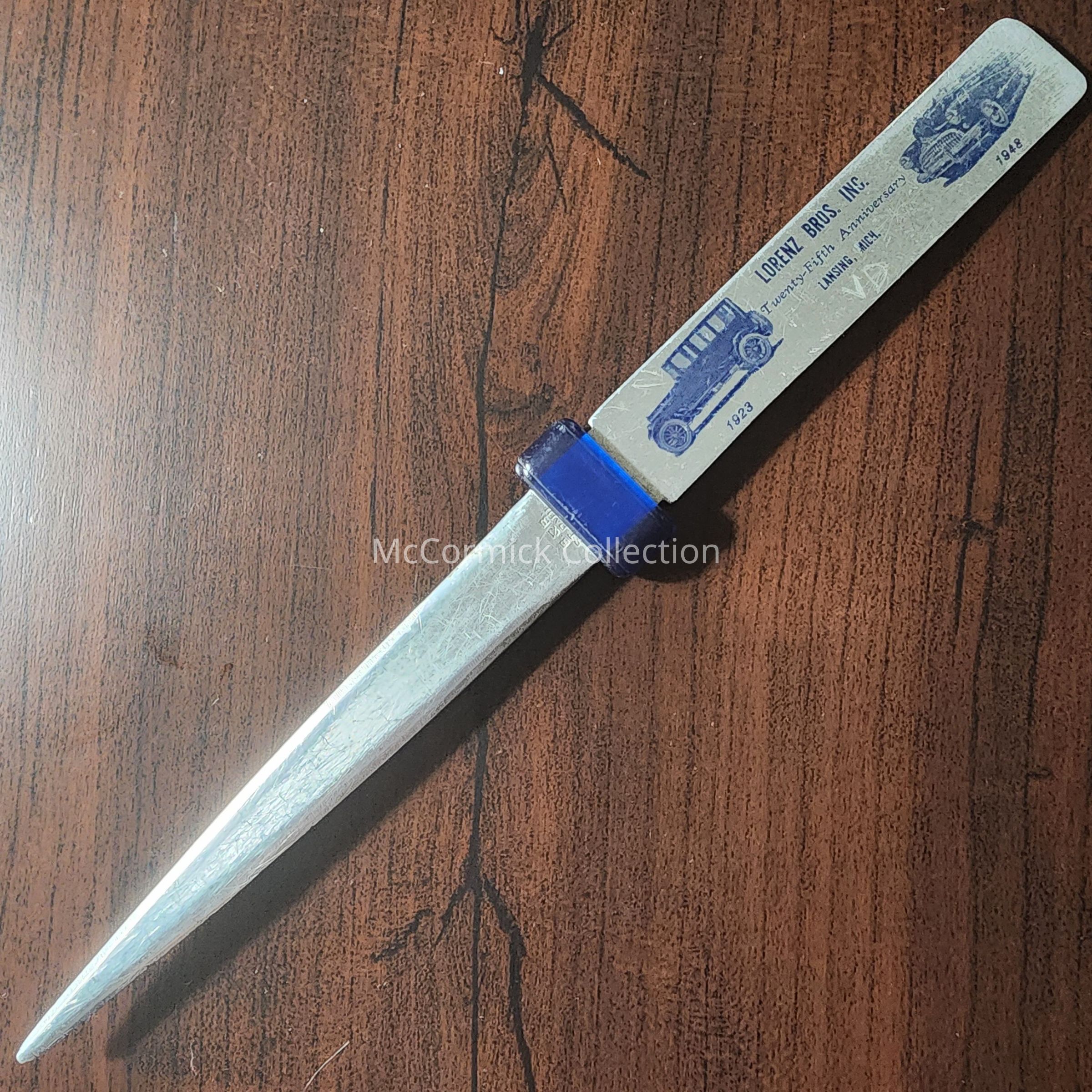 A metal advertising letter opener for the Lorenz Bros. Inc. cad dealers of Lansing, Michigan, from their 25th anniversary, 1948.
