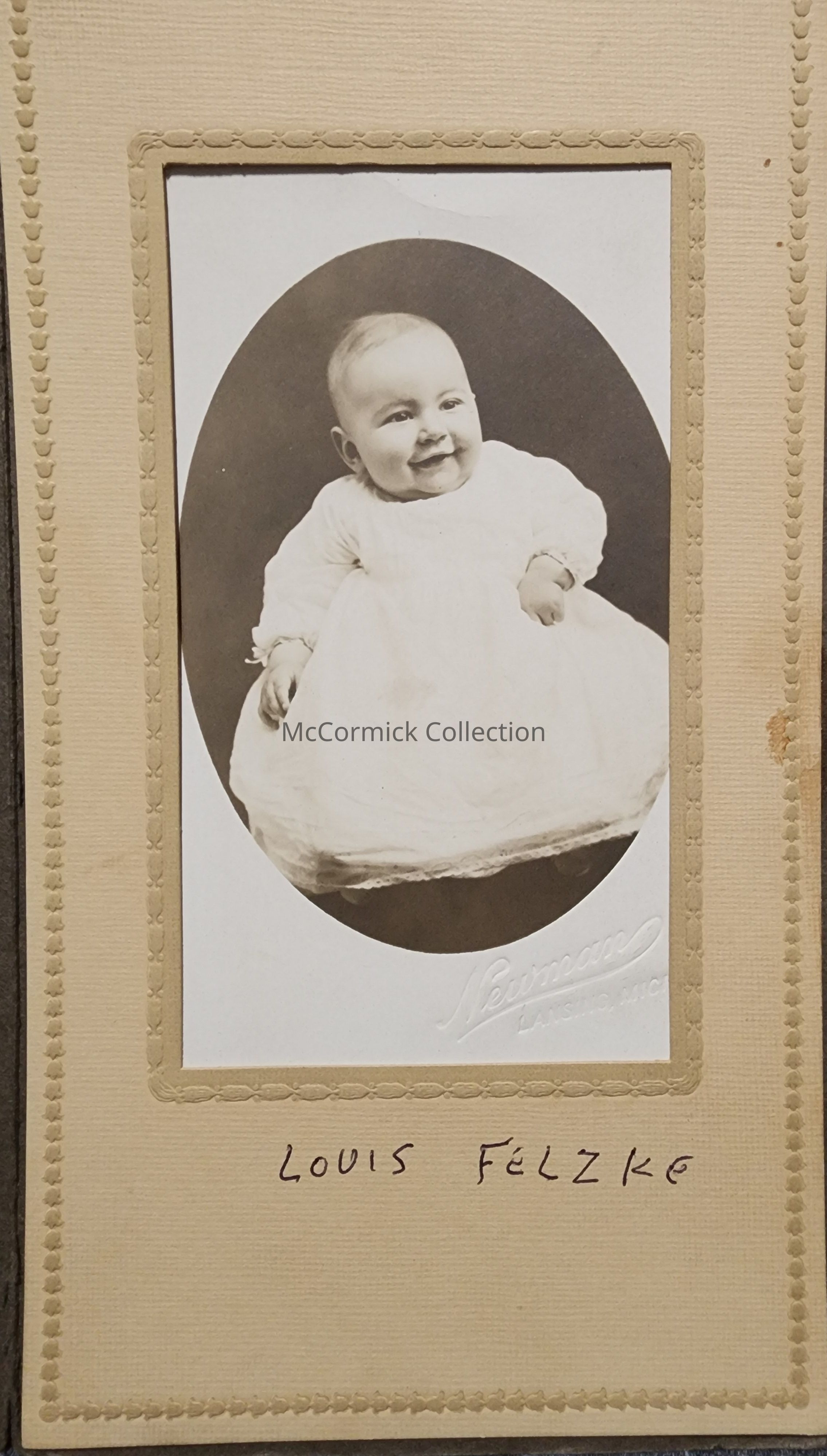 Folder mounting containing a real photo postcard of Louis Felzke by Lansing photographer Newman.